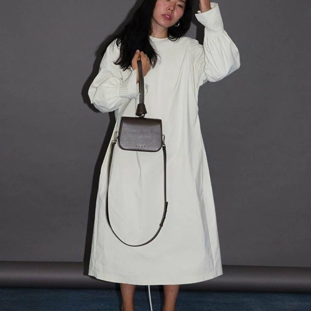 Aagé brings the small everyday bag with craftmanship in Italy from sustainable leather. With its adjustable and detachable crossbody strap as well as the detachable top handle shaped like an infinity knot, the bag offers much variety in its wear and styling. It can be worn crossbody and quickly transforms into a festive evening handbag or classic clutch.