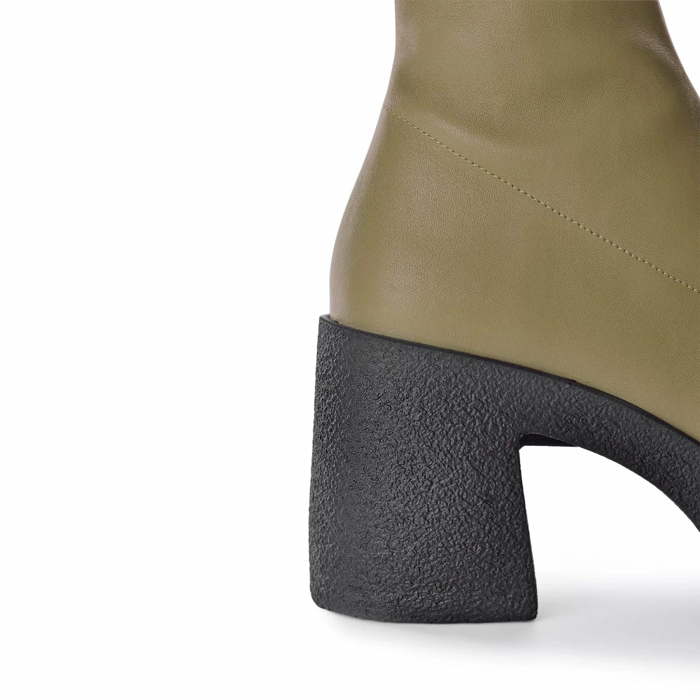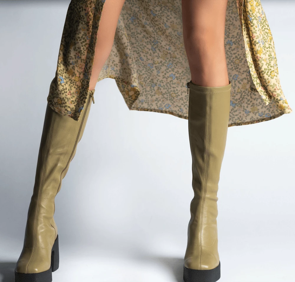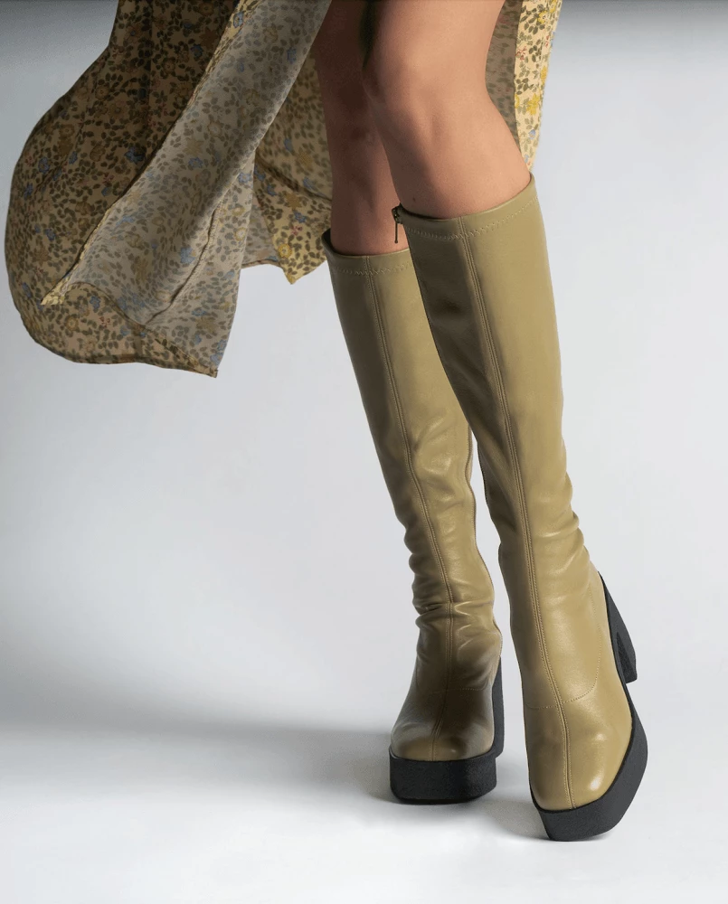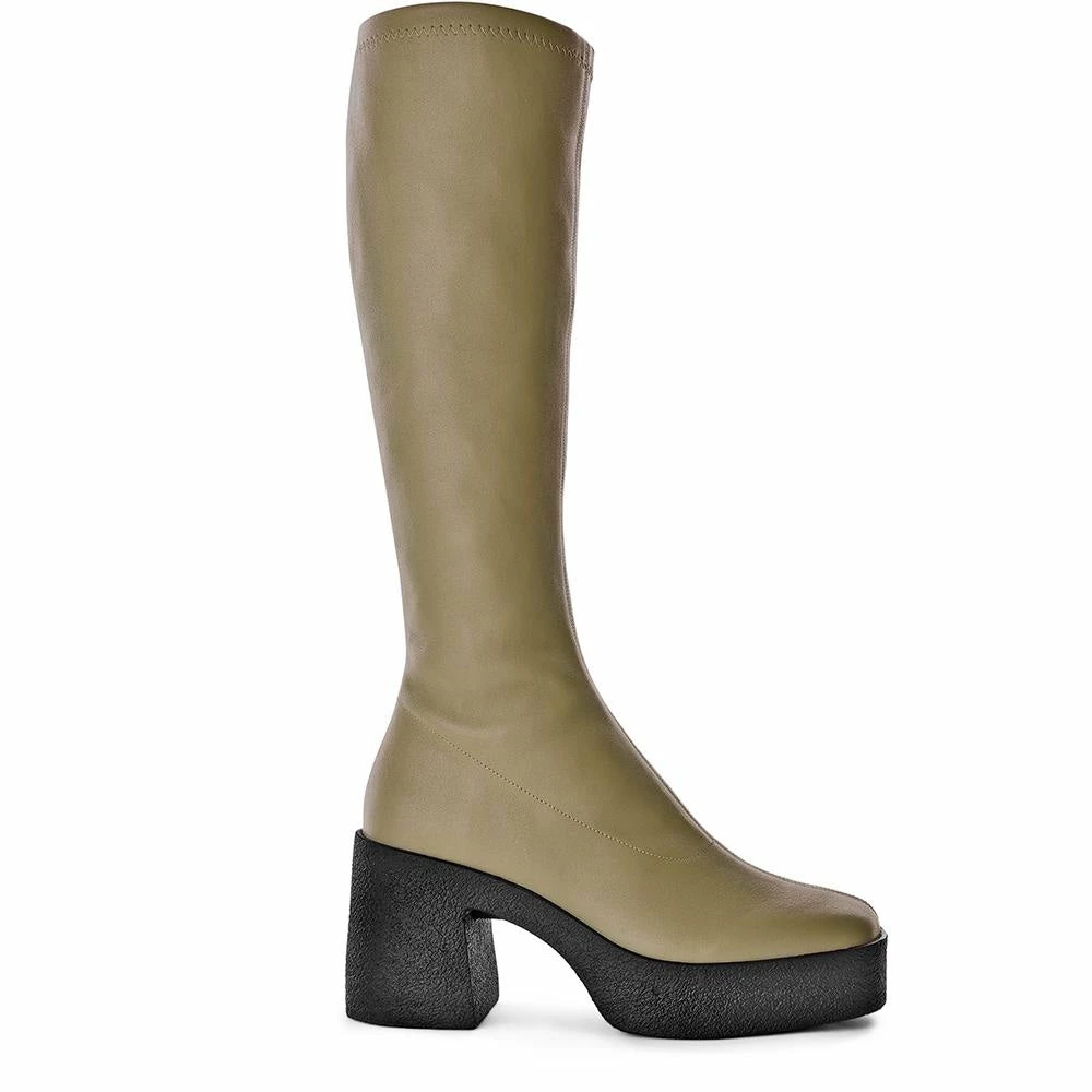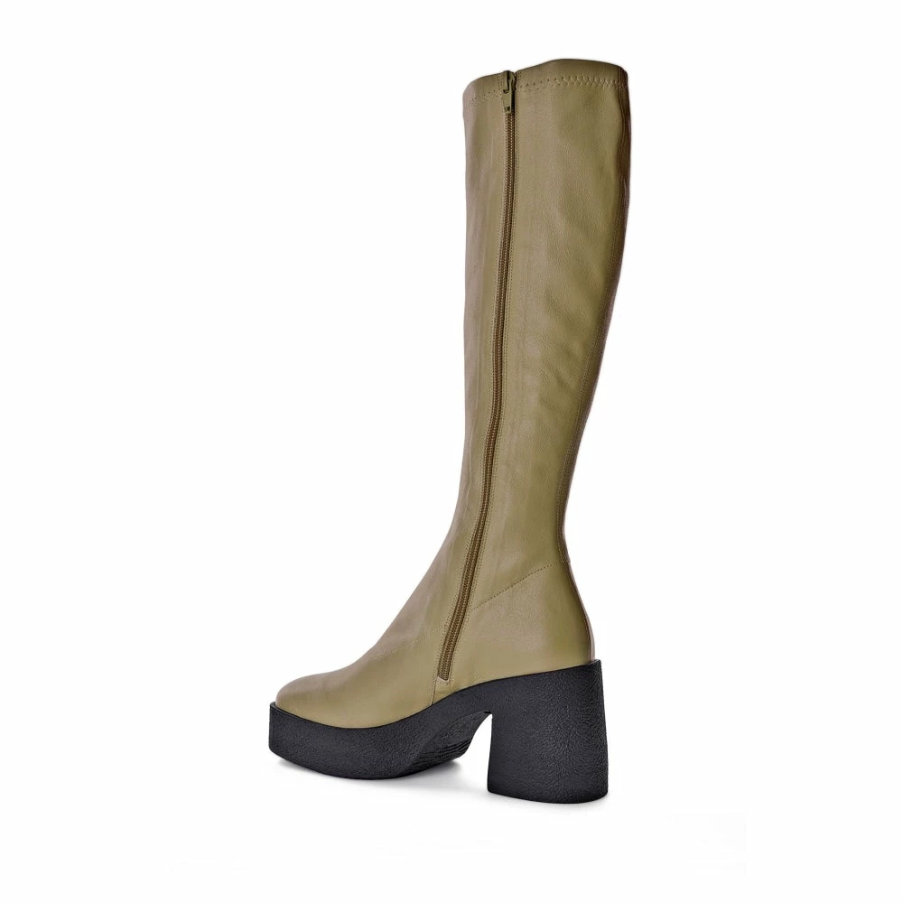 | Brand Model Product number Category Colour Material Lining Insole Outsole Heel Height Made in | AKAADA Izumi 20077-01-7 Knee-High Boots Khaki Soft Stretch Leather 100% Lamb Leather 100% Leather Rubber platform 8.5 cm EU |