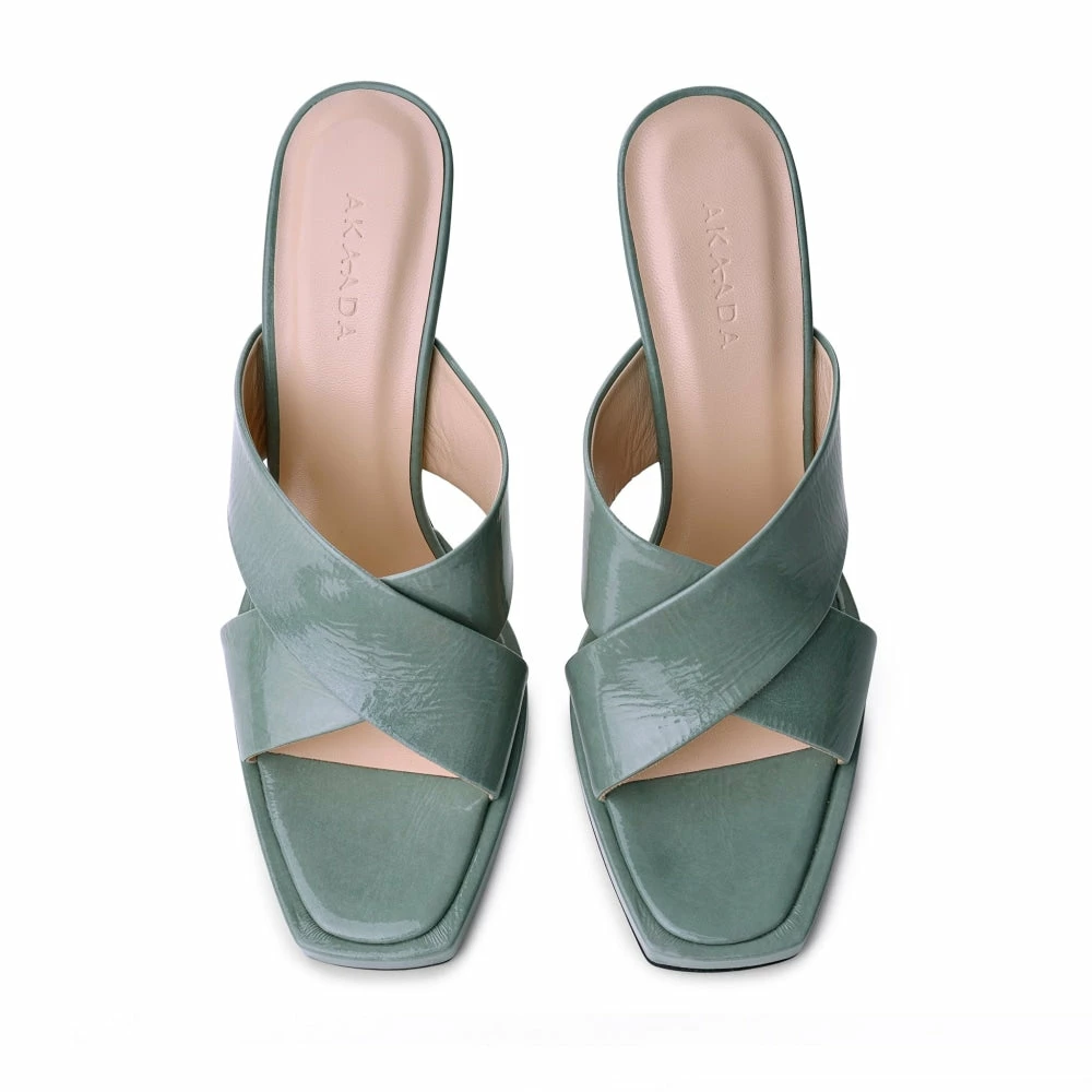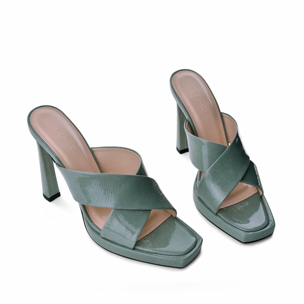 Dazzle in the beauty of these ‘KAORI PLATEAU’ platform mules from Akaada in avocado green shade. Handmade with 100% Italian goat leather, these sassy mules feature crossover straps on the front, a square toe, and a high-heel length of 4.72 inches.