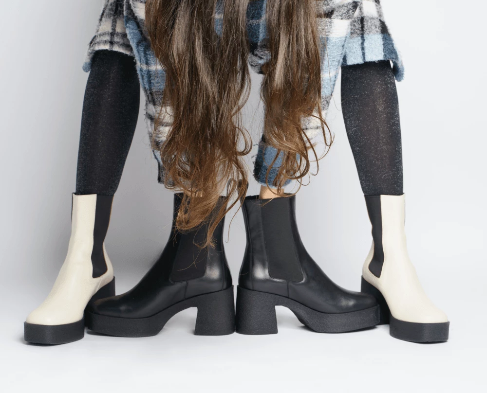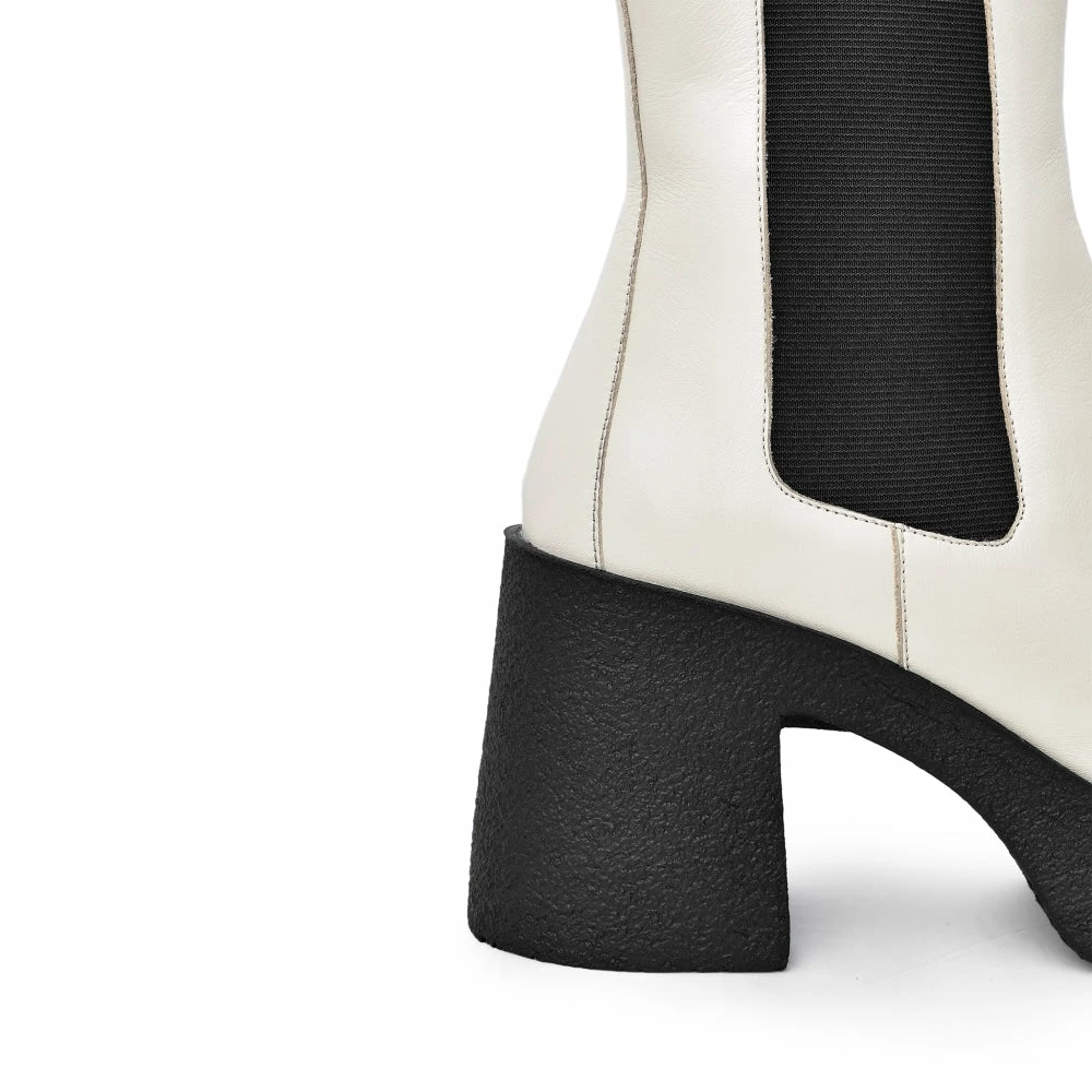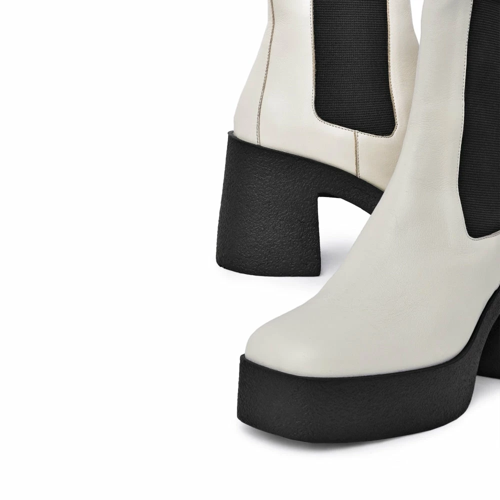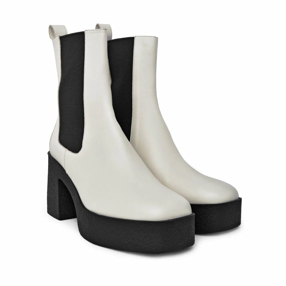 | Brand Model Product number Category Colour Material Lining Insole Outsole Heel Height Made in | AKAADA Momo 20077-04-02 Chelsea Boots Off White Soft Nappa Leather 100% Leather 100% Leather Rubber platform 8.5 cm EU |