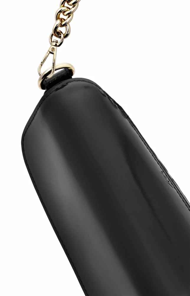 Style lavishly in the ‘Ena’ shoulder bag from ‘Akaada’ and be the slayer of chic fashion. This voguish ‘Black’ bag is made with 100% semi-patent calf leather that helps the bag rank high on quality and durability. It features a glossy leather upper with 4 cm inside depth and 17 cm height. It has a beautiful chain handle with a 21 cm drop.