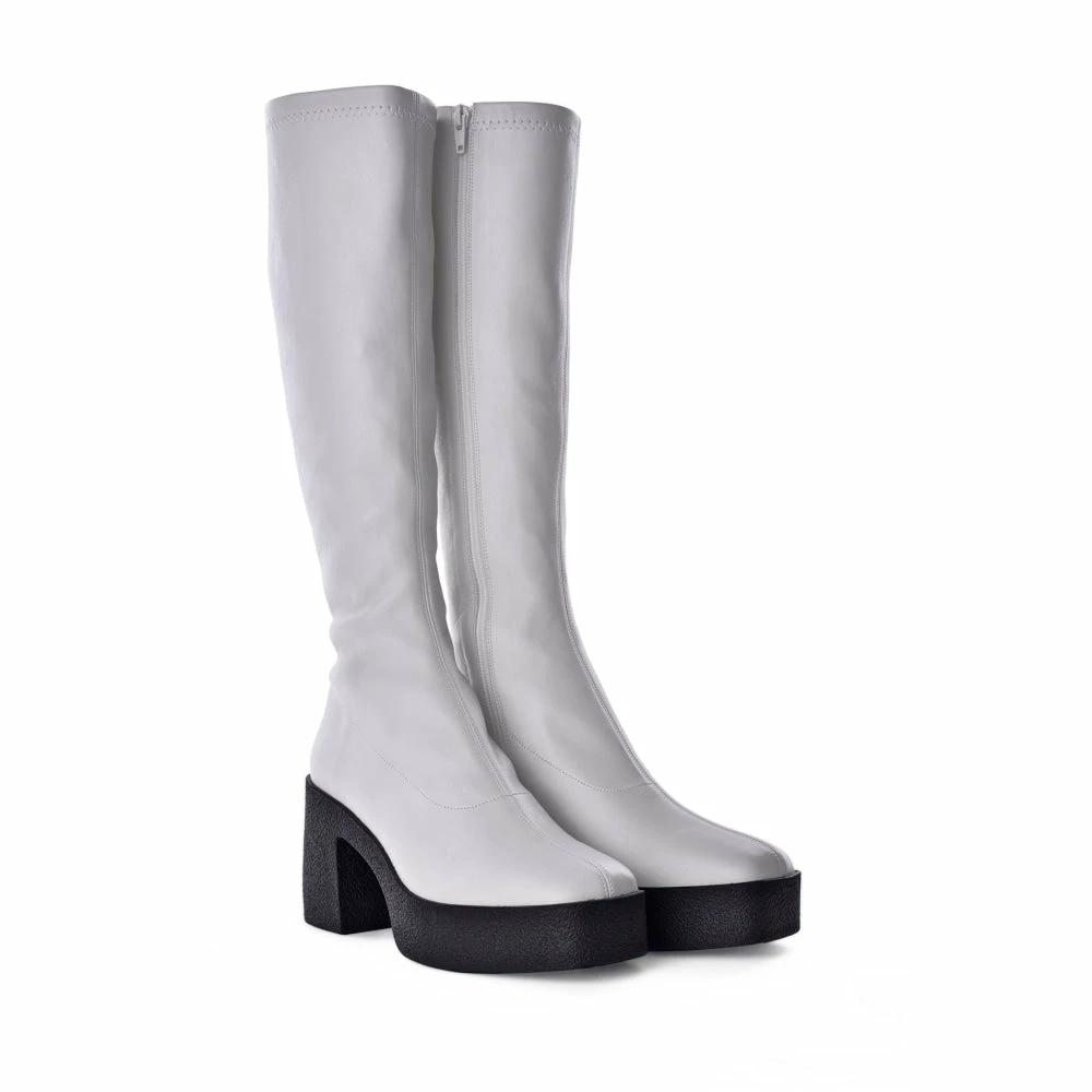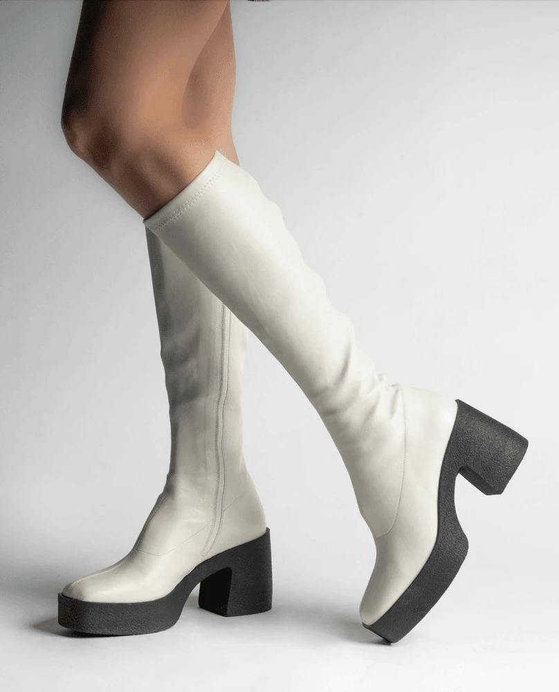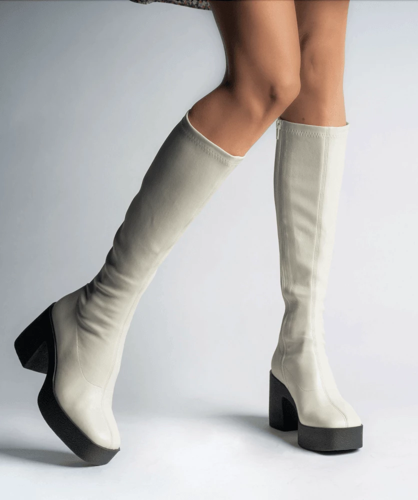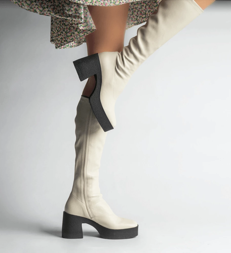 | Brand Model Product number Category Colour Material Lining Insole Outsole Heel Height Made in | AKAADA Izumi 20077-01-6 Knee-High Boots Off White Soft Stretch Leather 100% Lamb Leather 100% Leather Rubber platform 8.5 cm EU |