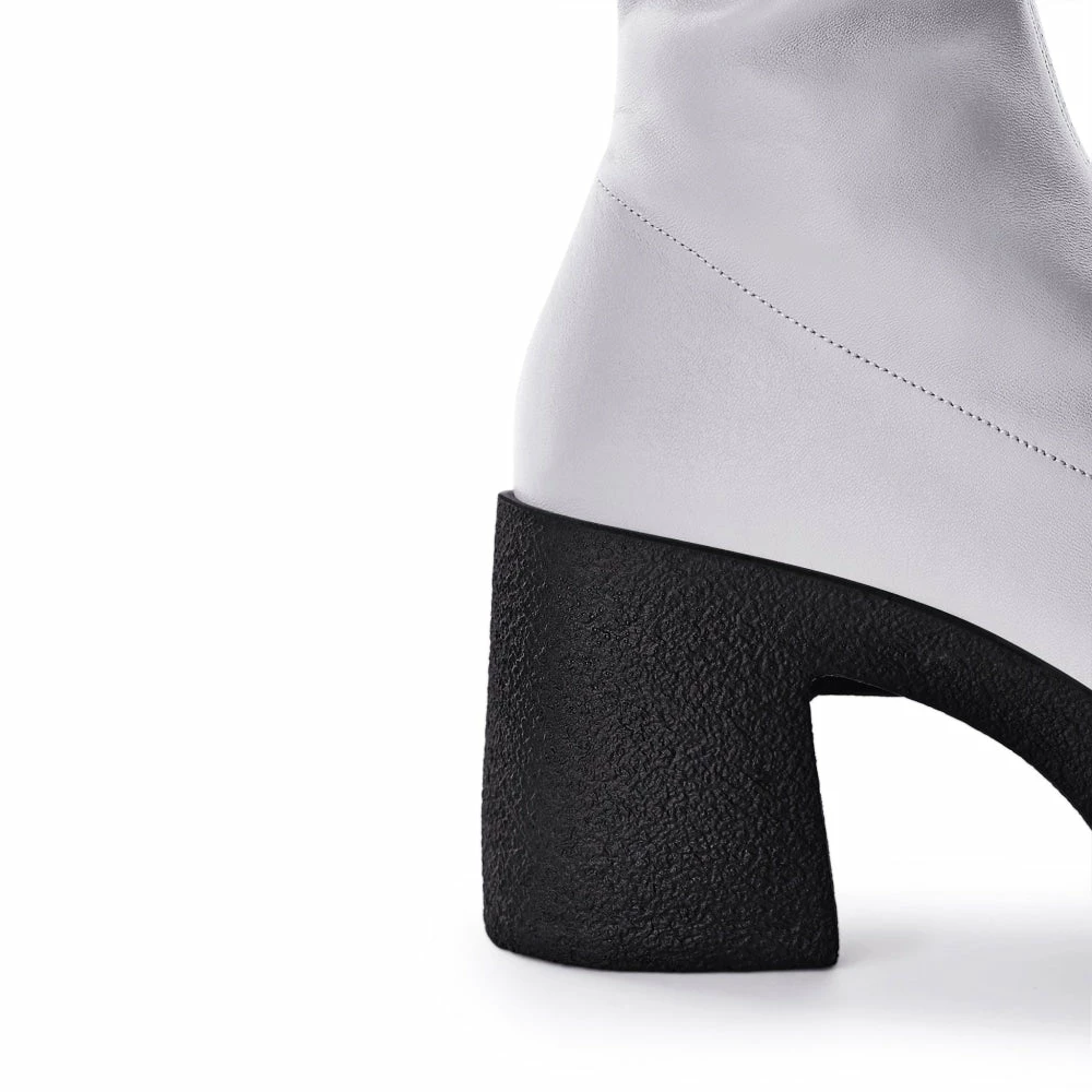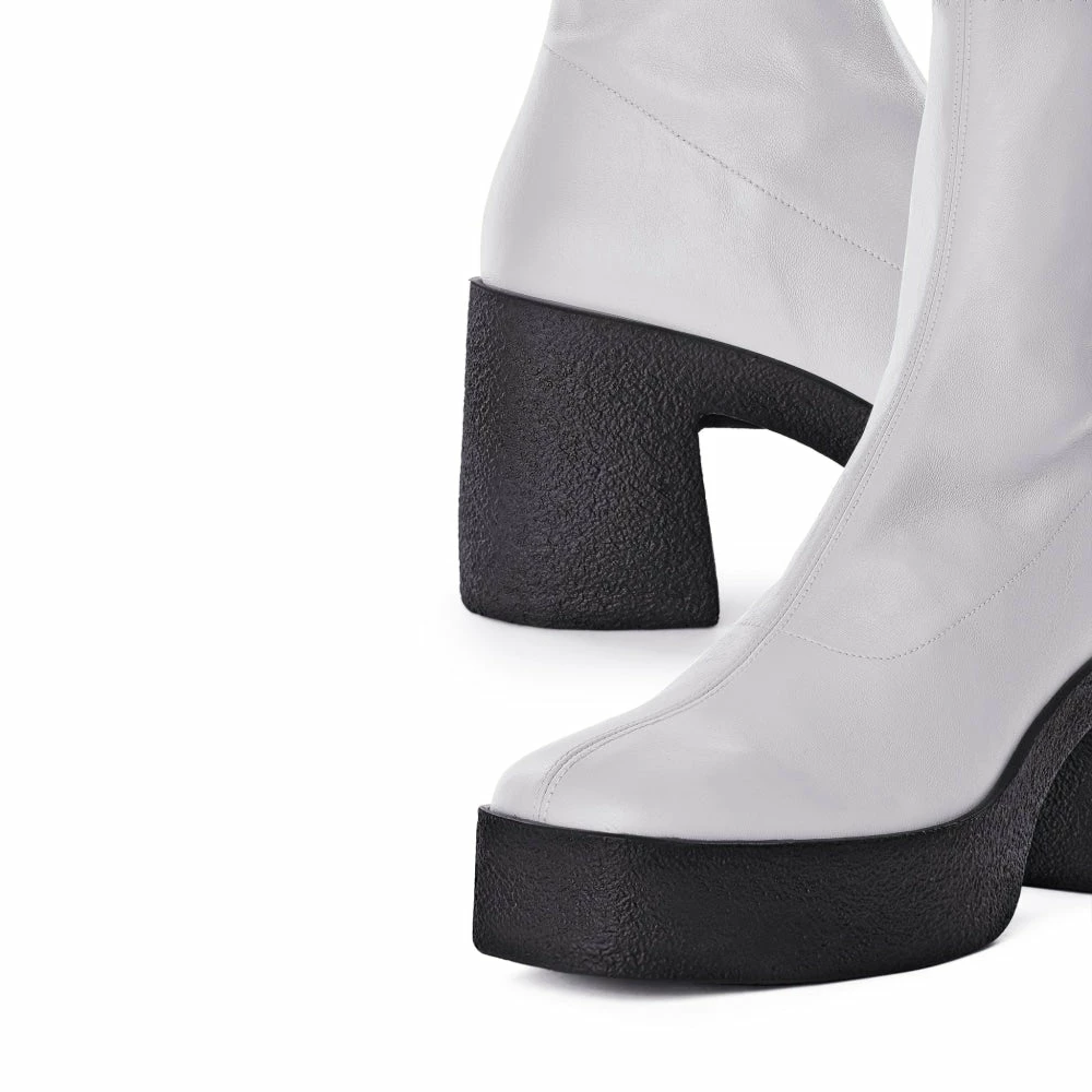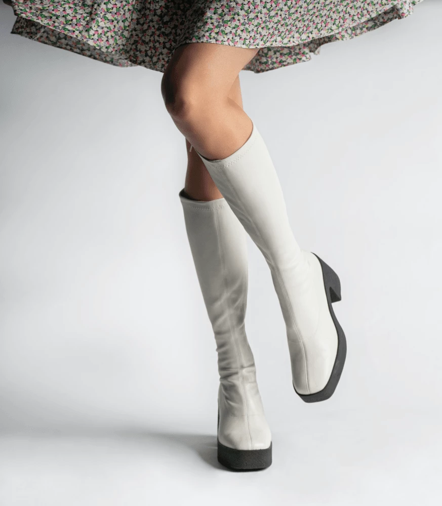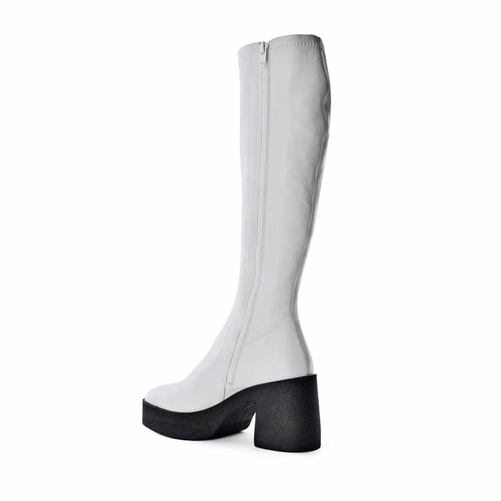 | Brand Model Product number Category Colour Material Lining Insole Outsole Heel Height Made in | AKAADA Izumi 20077-01-6 Knee-High Boots Off White Soft Stretch Leather 100% Lamb Leather 100% Leather Rubber platform 8.5 cm EU |