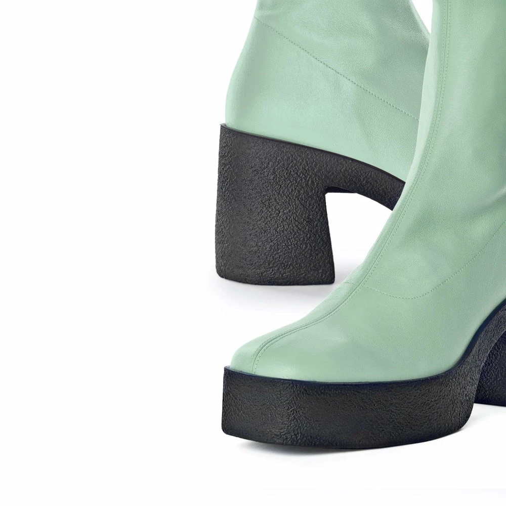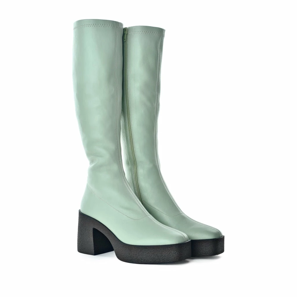 | Brand Model Product number Category Colour Material Lining Insole Outsole Heel Height Made in | AKAADA Izumi 20077-01-8 Knee-High Boots Pastel Green Soft Stretch Leather 100% Lamb Leather 100% Leather Rubber platform 8.5 cm EU |