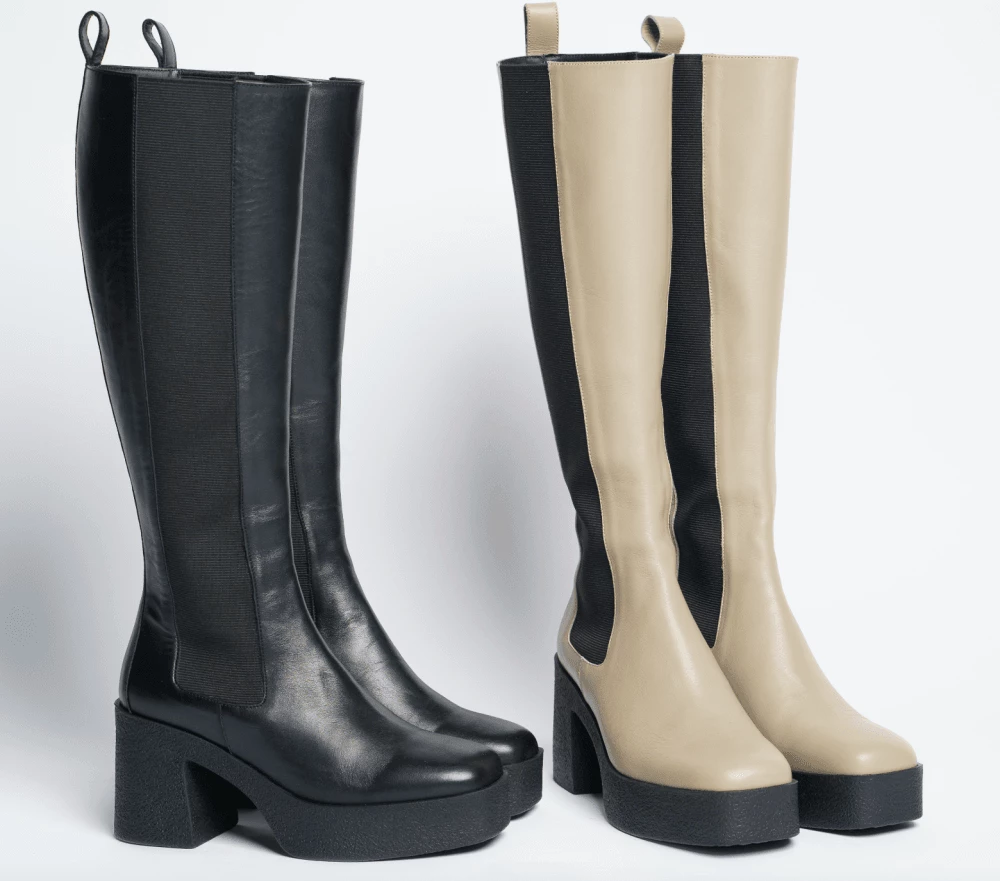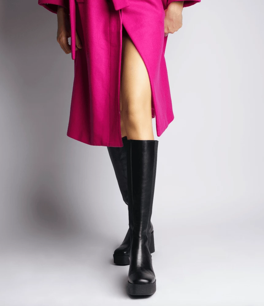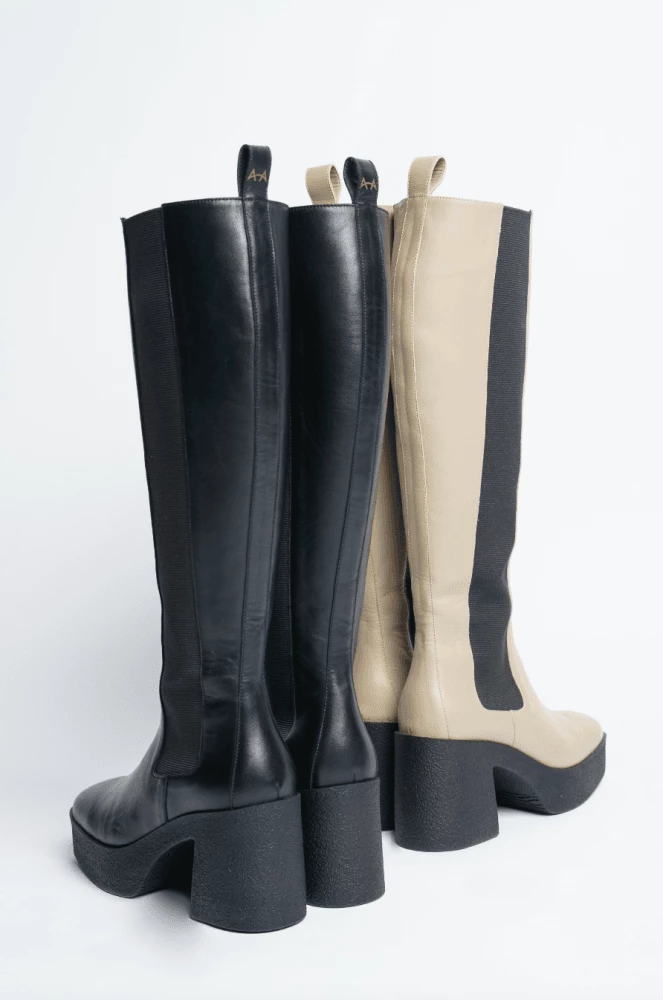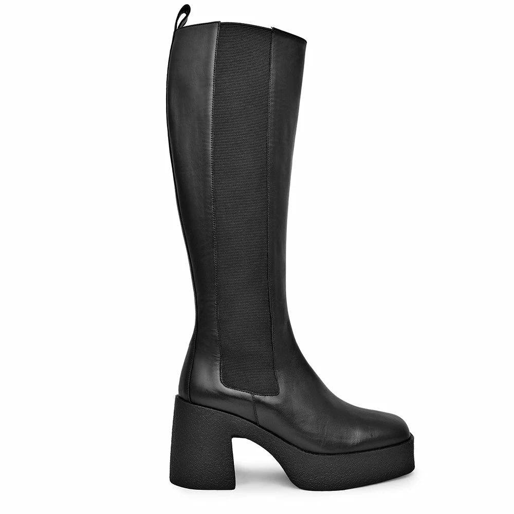 | Brand Model Product number Category Colour Material Lining Insole Outsole Heel Height Made in | AKAADA Momoko 20077-05-01 Knee-High Boots Black Nappa Leather 100% Leather 100% Leather Rubber platform 8.5 cm EU |