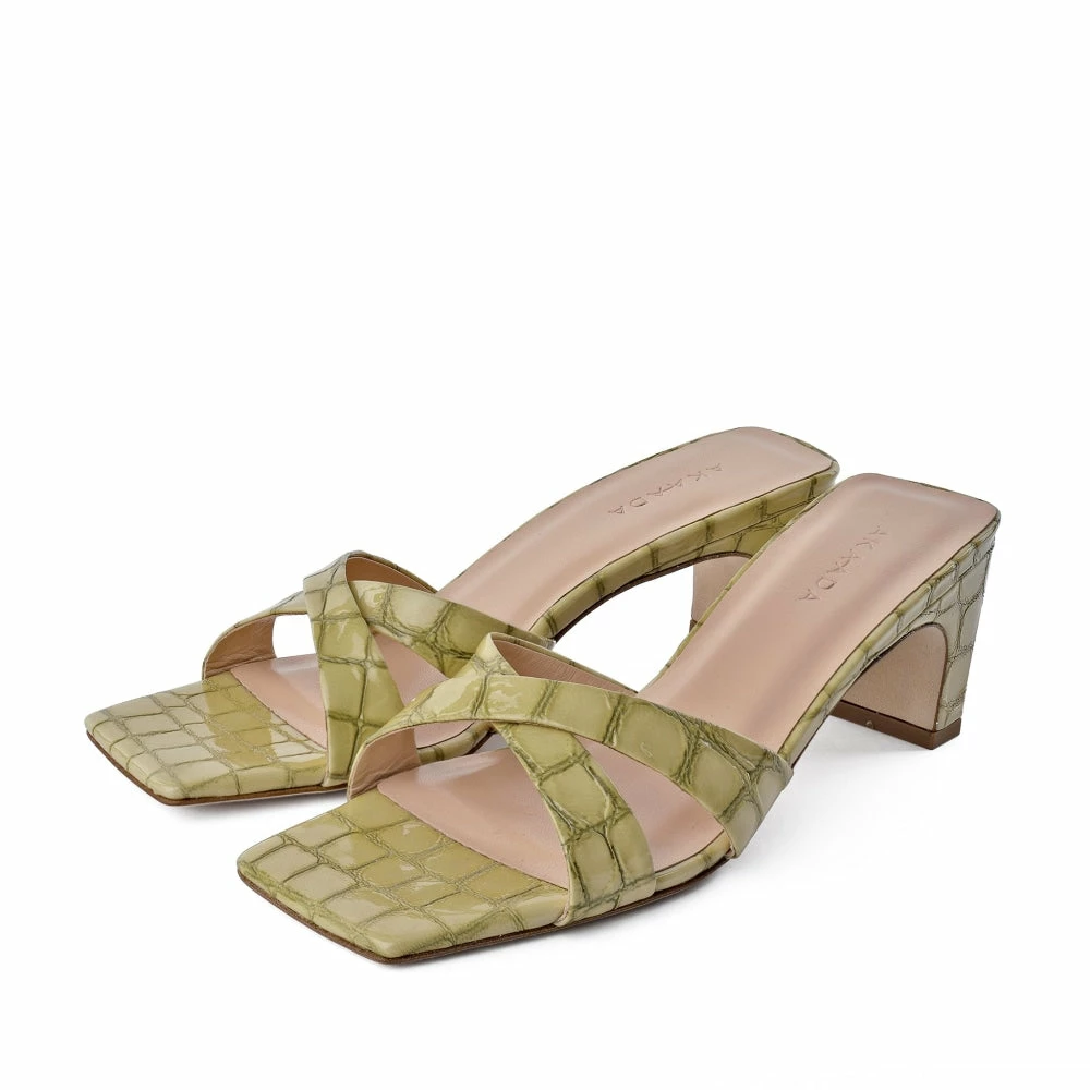 | Brand Model Product number Category Colour Material Lining Insole Outsole Heel Height Made in | AKAADA Yumi 20033-04-6 Sandals Pistachio Soft Calf Leather 100% Italia Leather 100% Italian Soft Leather Leather sole 7 cm / 2.75 inches Hand made in EU |