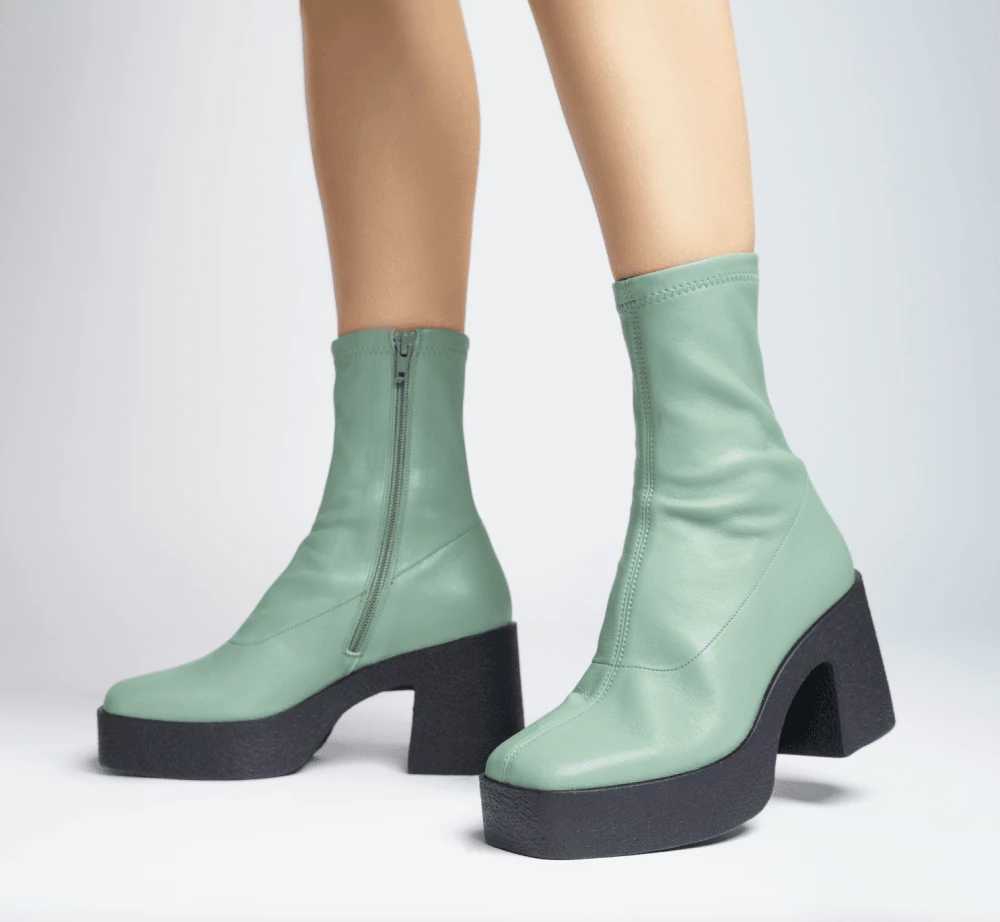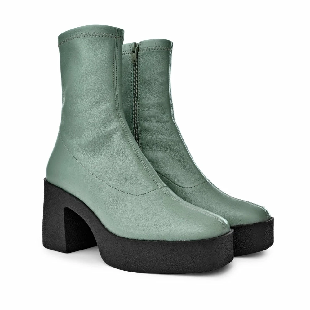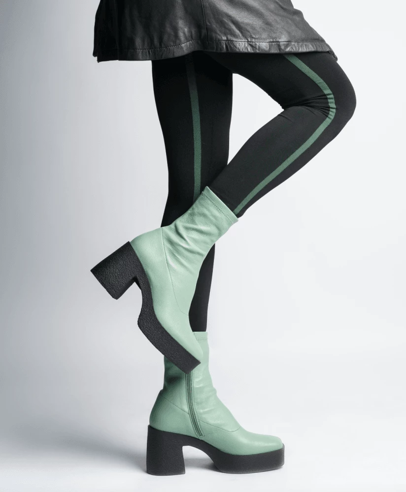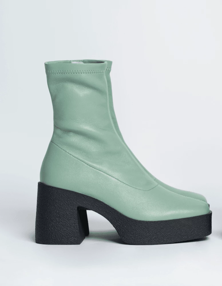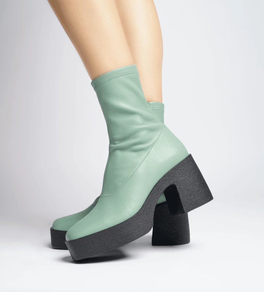 | Brand Model Product number Category Colour Material Lining Insole Outsole Heel Height Made in | AKAADA Umi 20077-02-10 Ankle Boots Sage Green Soft Stretch Leather 100% Lamb Leather 100% Leather Rubber platform 8.5 cm EU |