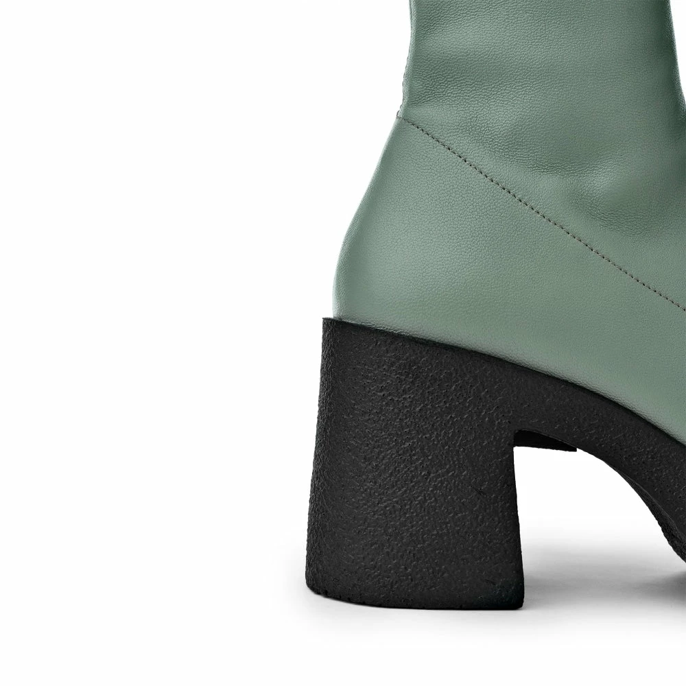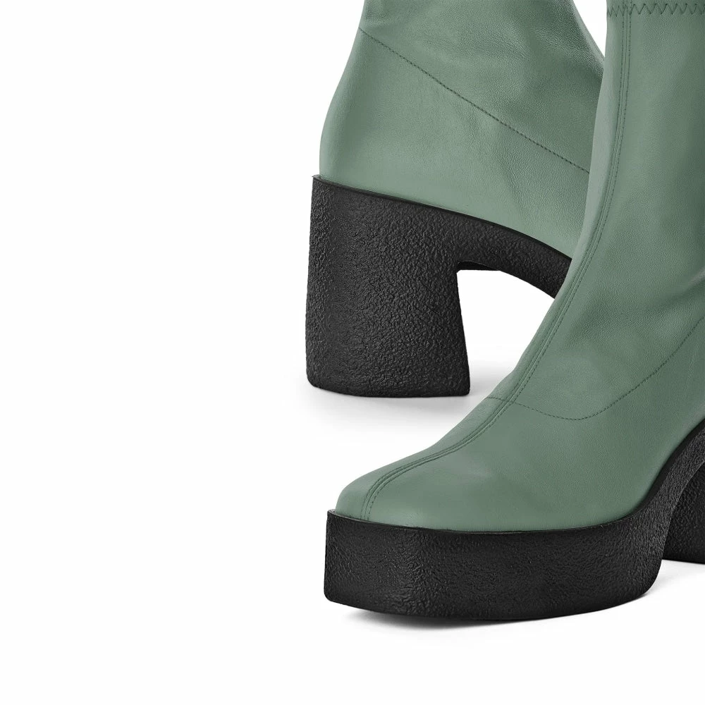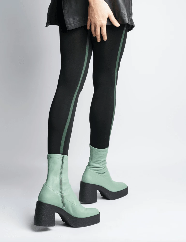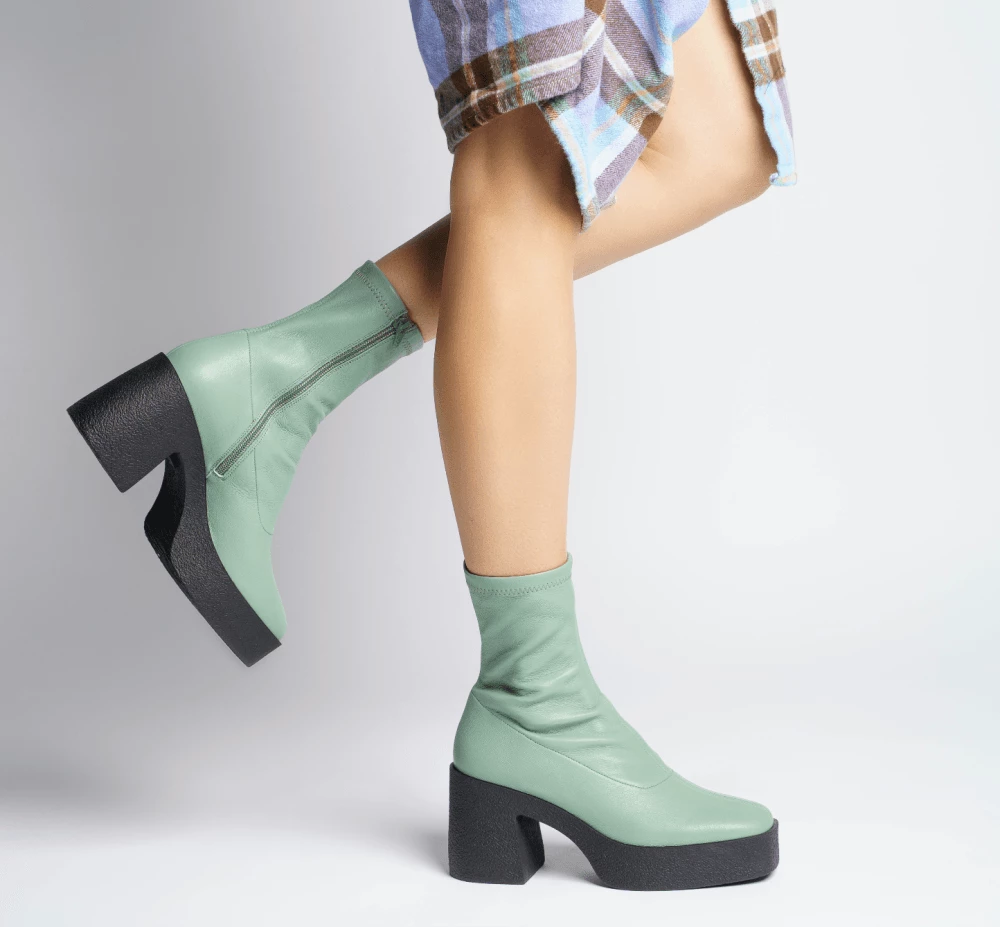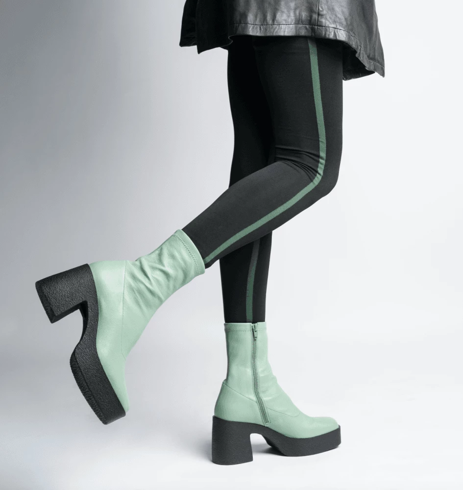 | Brand Model Product number Category Colour Material Lining Insole Outsole Heel Height Made in | AKAADA Umi 20077-02-10 Ankle Boots Sage Green Soft Stretch Leather 100% Lamb Leather 100% Leather Rubber platform 8.5 cm EU |