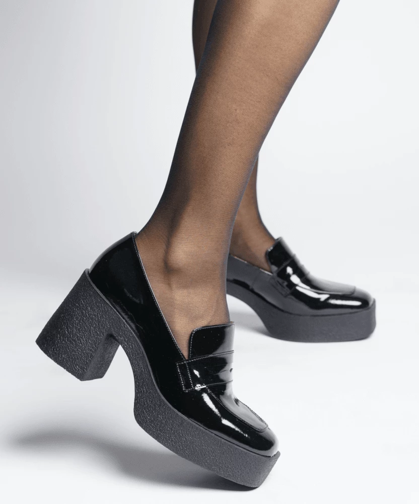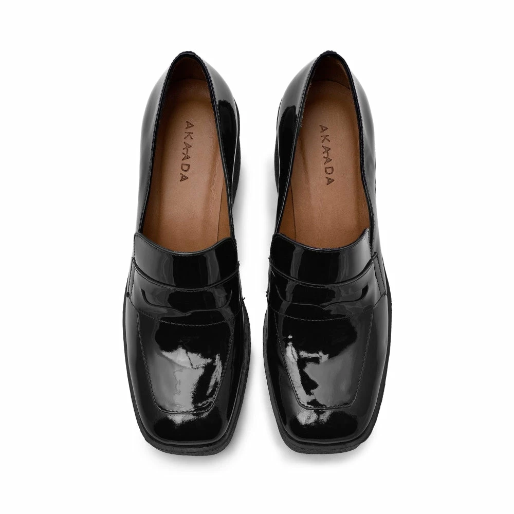 | Brand Model Product number Category Colour Material Lining Insole Outsole Heel Height Made in | AKAADA Yoko 21031-01-02 Chunky Loafers Black Patent Leather 100% Calf Leather 100% Leather Rubber platform 8.5 cm EU |