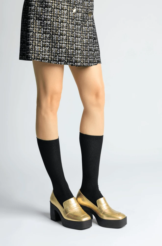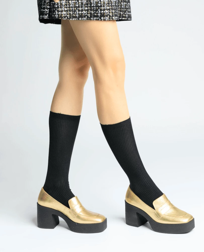 | Brand Model Product number Category Colour Material Lining Insole Outsole Heel Height Made in | AKAADA Yoko 21031-01-11 Chunky Loafers Gold Patent Leather 100% Calf Leather 100% Leather Rubber platform 8.5 cm EU |