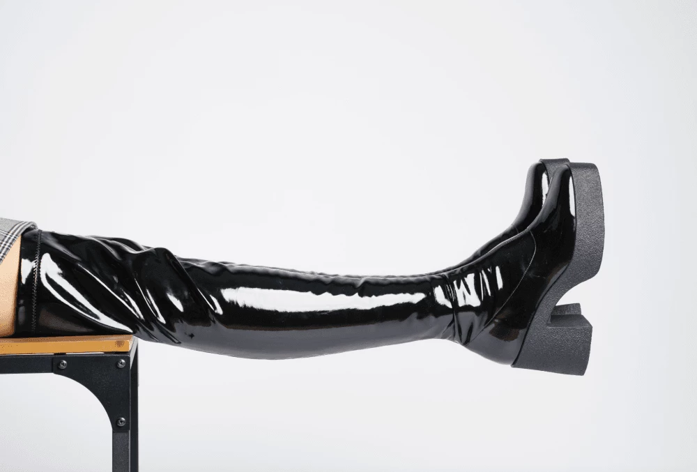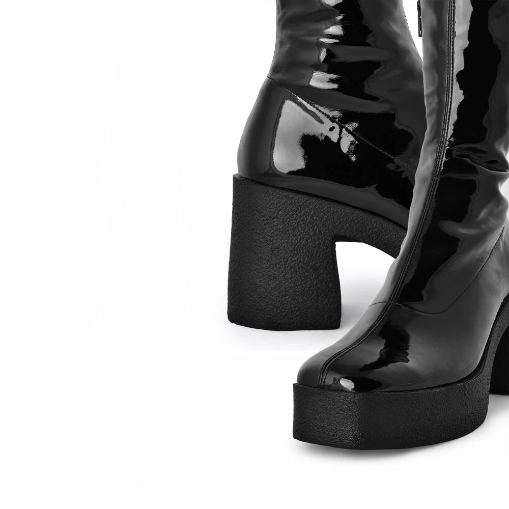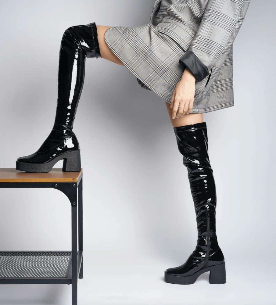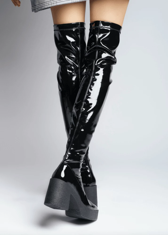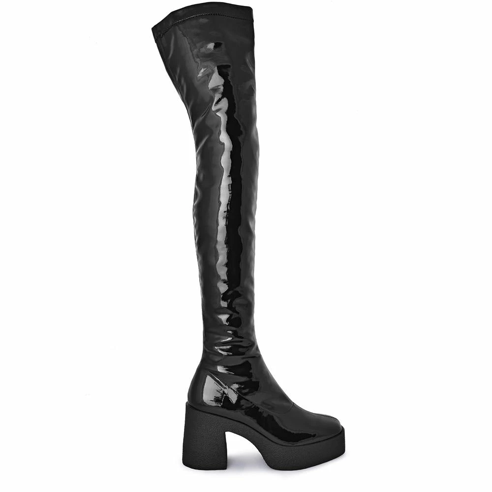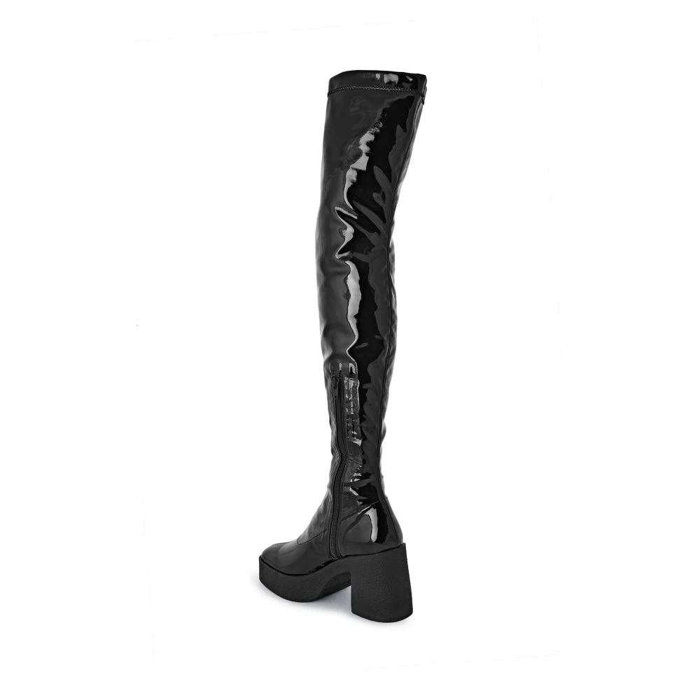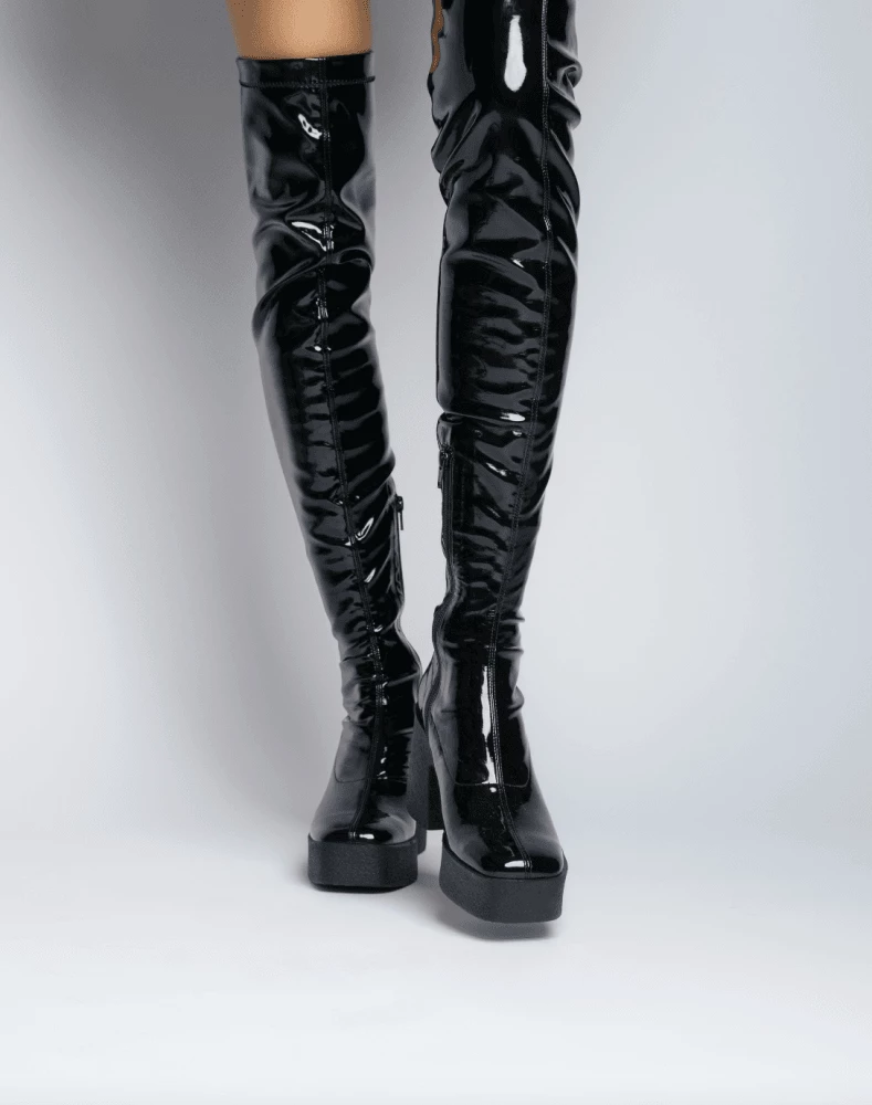 | Brand Model Product number Category Colour Material Lining Insole Outsole Heel Height Made in | AKAADA Yoshi 20077-03-02 Thigh-High Boots Black Stretch Patent Vegan Leather Vegan Leather Leather Rubber platform 8.5 cm EU |