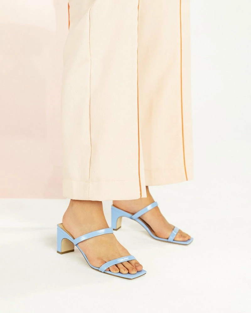 With a small 7 cm heel, a square toe, and two stylish soft leather strap design, these stylish and minimalist sandals are the perfect getaway from boring fashion. These blue sandals come packed in the original Akaada dustbag. Also available in black, white, gold, and nude beige shades.