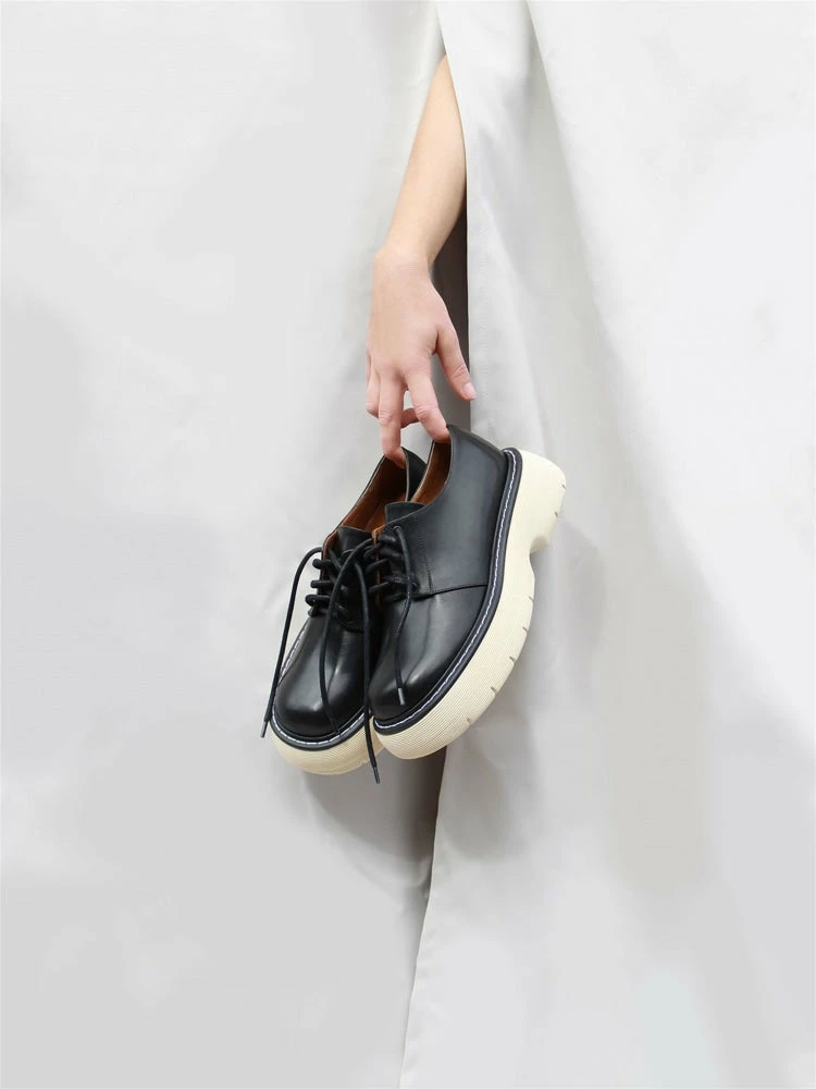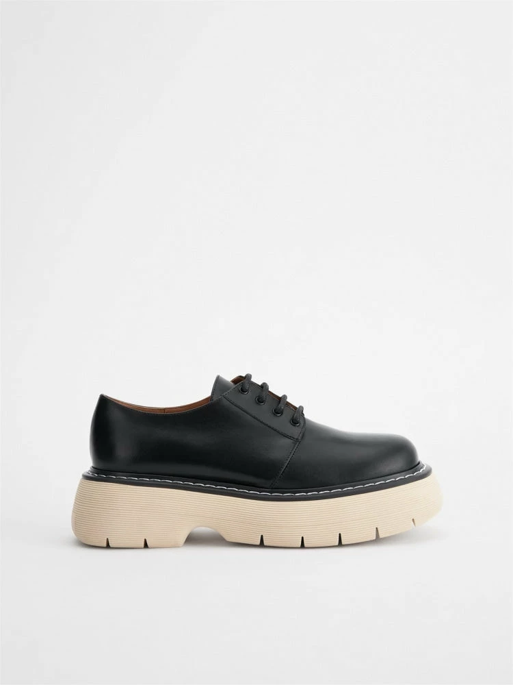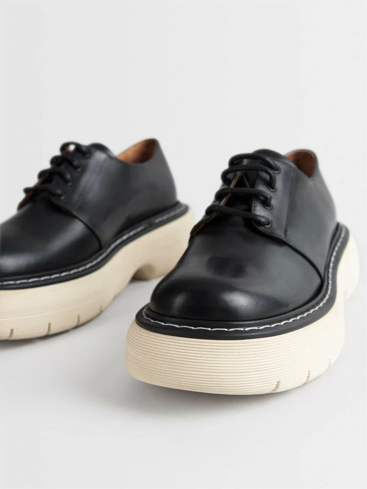 They feature a round toe, a glossy leather upper, lace-up fastening, and a chunky 4.5 cms platform in wooden finish. The insoles are extremely soft and comfortable for an all day long wear. The rugged rubber outsole is durable and helps the shoe to last longer in your closet.