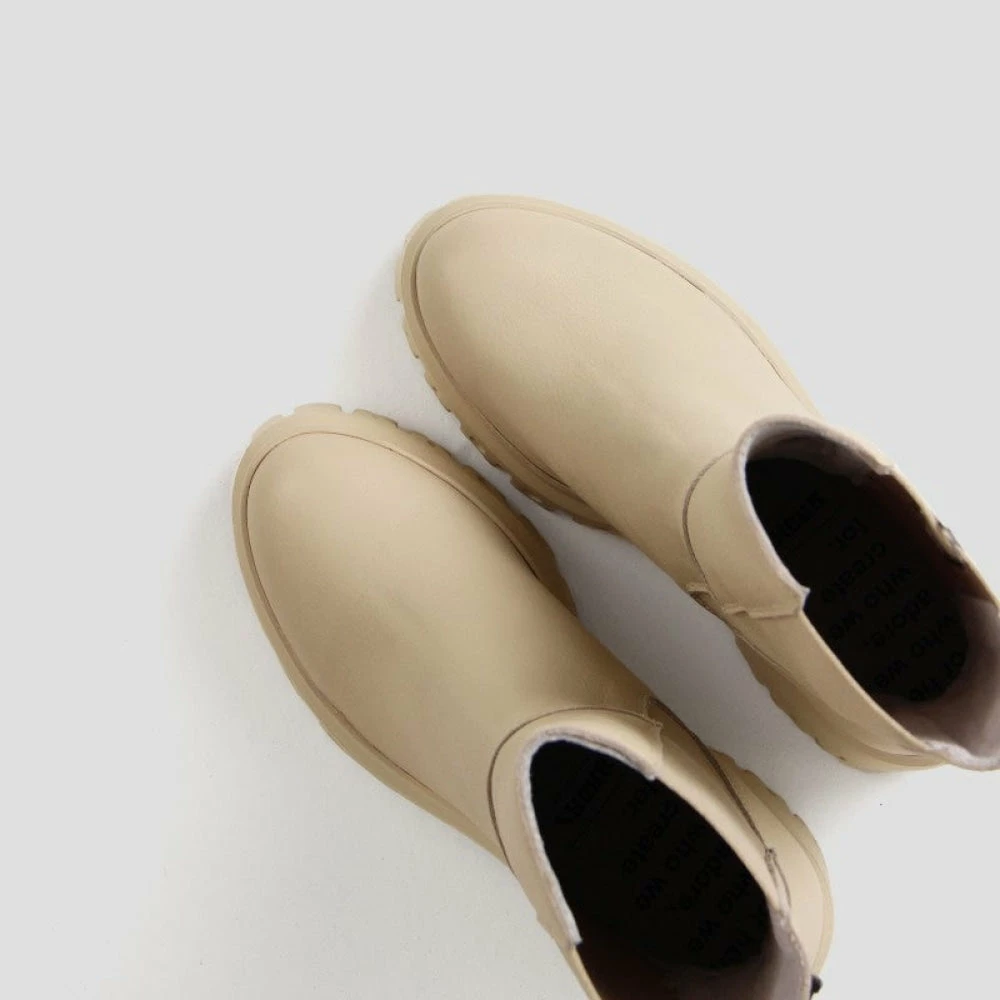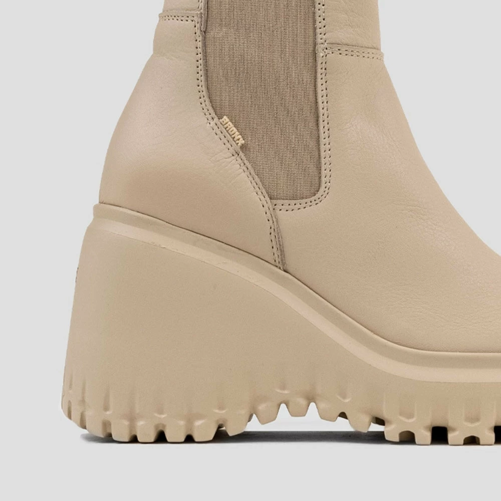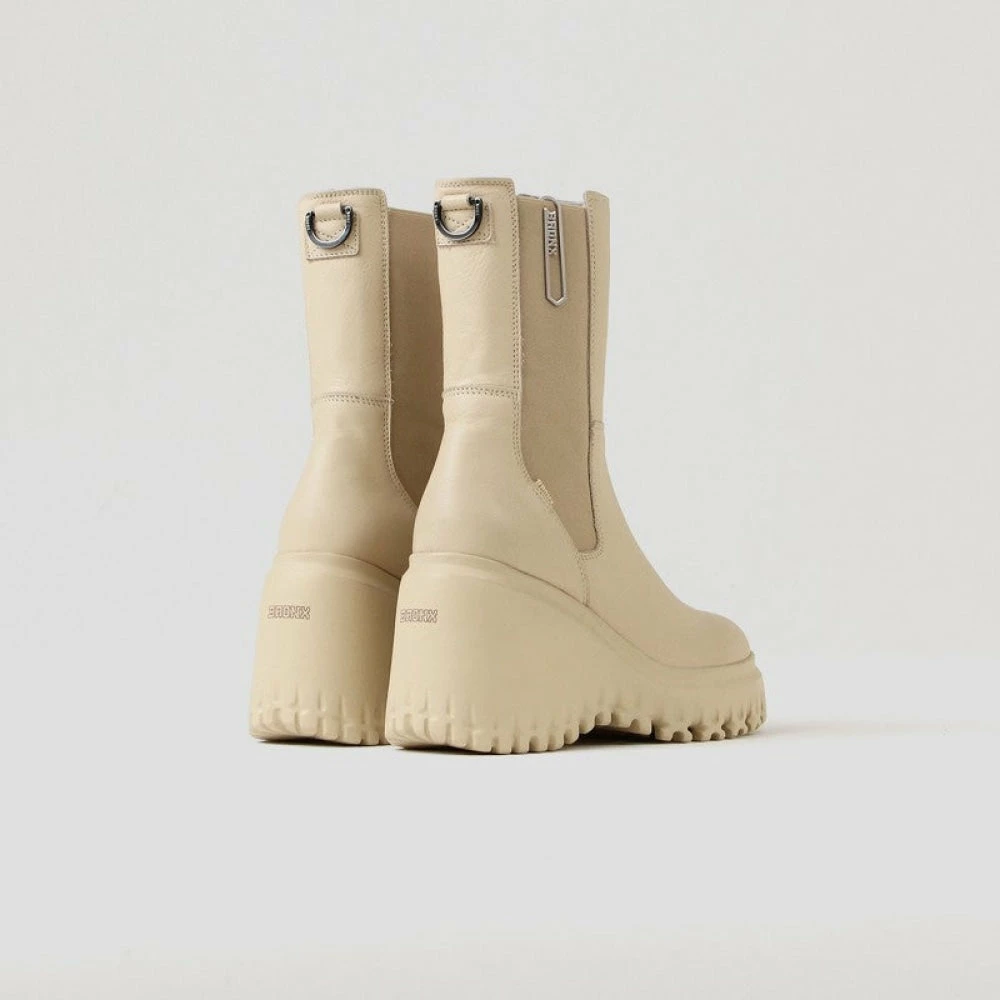 Dress responsibly in ‘Curv-Y Chelsea’ boots from ‘Bronx’ made with sustainable cow leather. These chic and stylish ‘Camel’ boots feature a leather upper, 20 cm shaft, elastic fastening on the sides, a chunky 3 cm platform, and a 10 cm heel that looks voguish and modern.