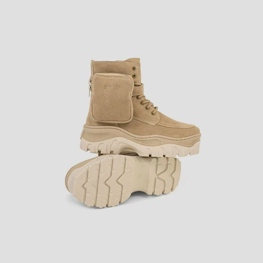 They feature a suede leather upper, a chunky 4 cm platform, a 16 cm shaft, and a specially designed pouch on the right shoe. The pouch is attached to the shoe using BRONX’s X clip and is removable. The lace and zip fastening looks cool and ensures an easy slip into the shoe. The insoles are highly comfortable and removable.