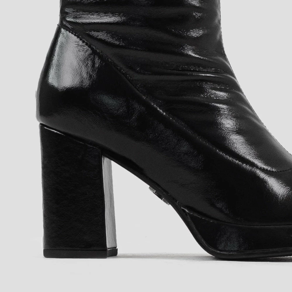 Deliver your most luxurious and fashionable looks with ‘New Melanie’ ankle boots from ‘Bronx.’ These exquisite ‘Black’ boots feature a square toe, a shimmery upper with a seam in the centre, a 21 cms stretchy shaft, and an 8.5 cms block heel. They are made in India with naplak stretch leather and synthetic leather lining. They come with a synthetic insole that’s immensely comfortable and soft for the feet.