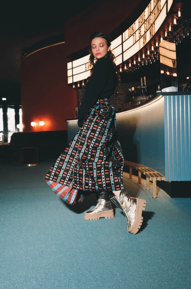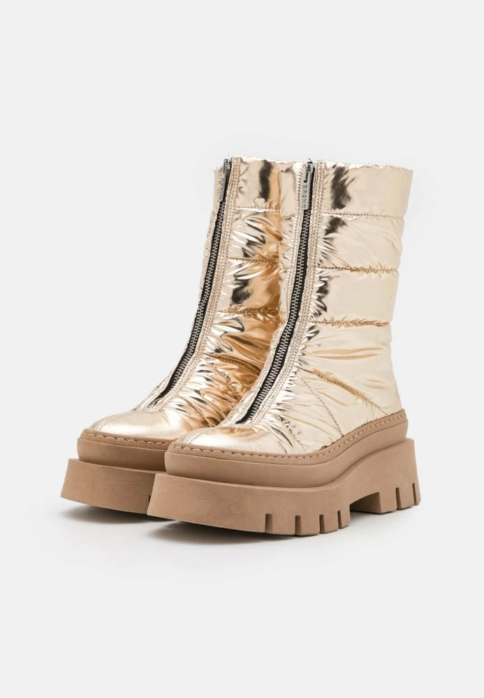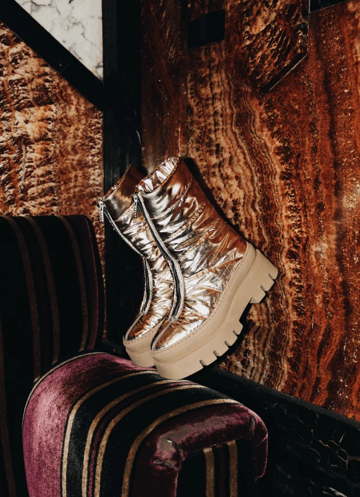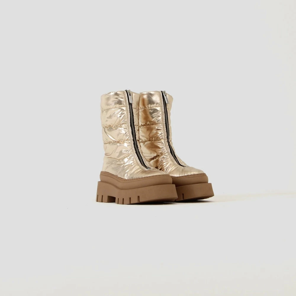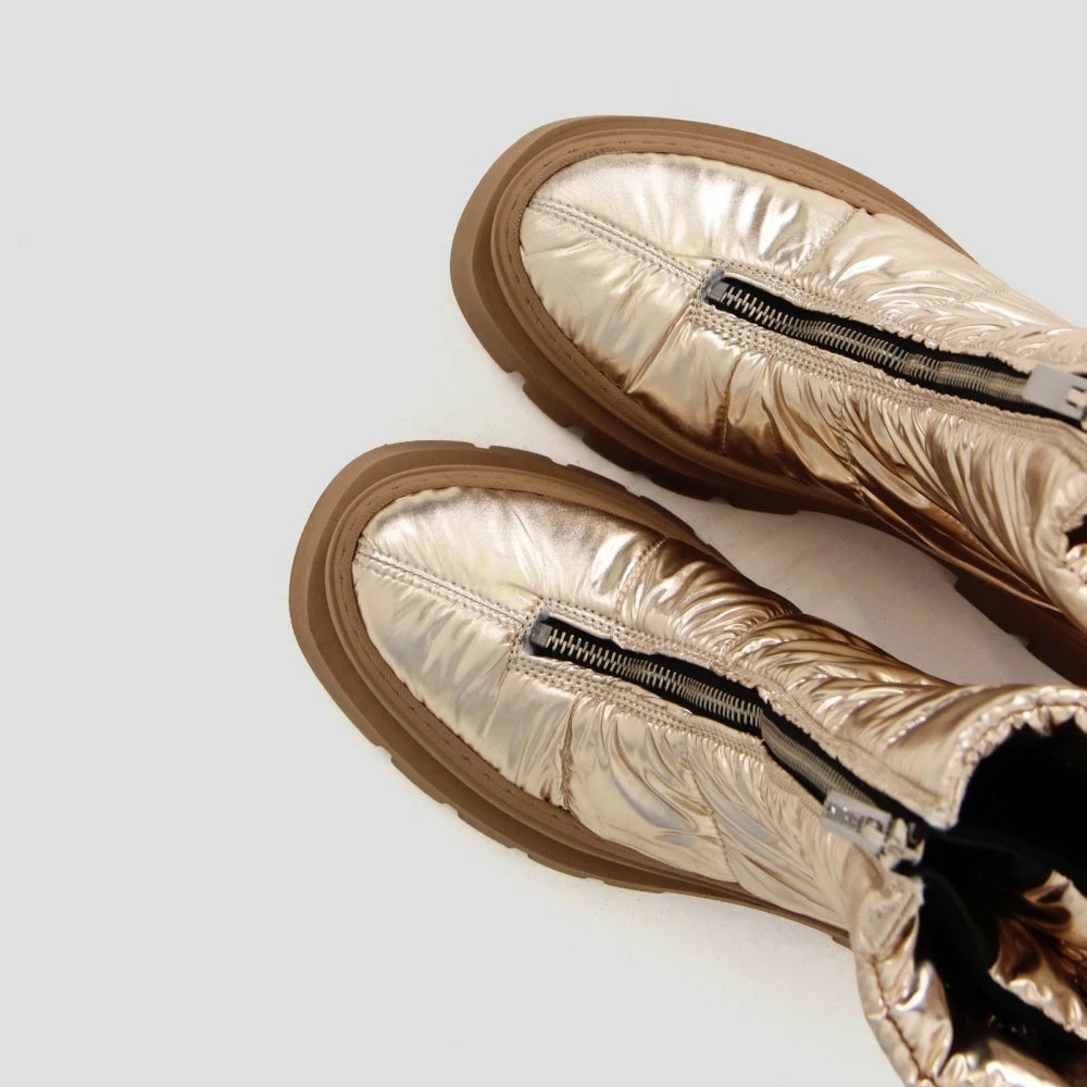 | Brand Model Product number Category Colour Material Lining Schaft Height Heel Height Removable Sole Closure Made in | BRONX Evi-Ann 47379-P-2207 Boots Gold Synthetic Synthetic 21 cm 4.5 cm Yes Zipper Portugal |