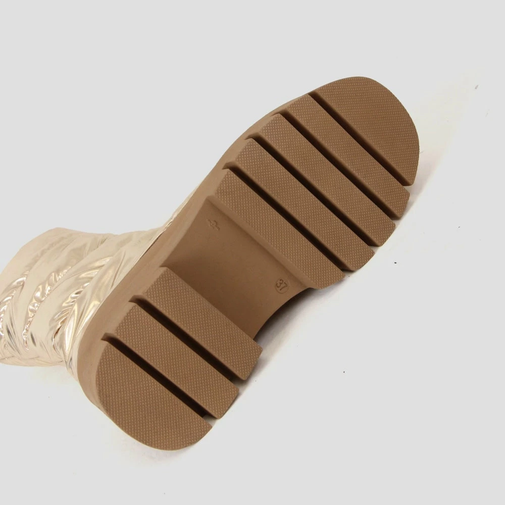 Dress casual with the luxury of these classy and swanky ‘Evi-Ann’ chunky boots from ‘Bronx.’ These eye-catching ‘Champagne’ boots are made with great-quality synthetic leather for a longer life with synthetic lining for added strength. They feature a rounded toe, a glossy synthetic upper with zip fastening on the front, 21 cm shaft, and a chunky platform with mudguard. The synthetic insoles are removable and offer cushioned comfort. These ‘Made in Portugal’ boots come with a 4.5 cm heel on a groovy and rugged rubber outsole. Pair these fashionable boots with a short skirt, a long skirt, or even a long dress or skirt, and be the queen of sassy styling.