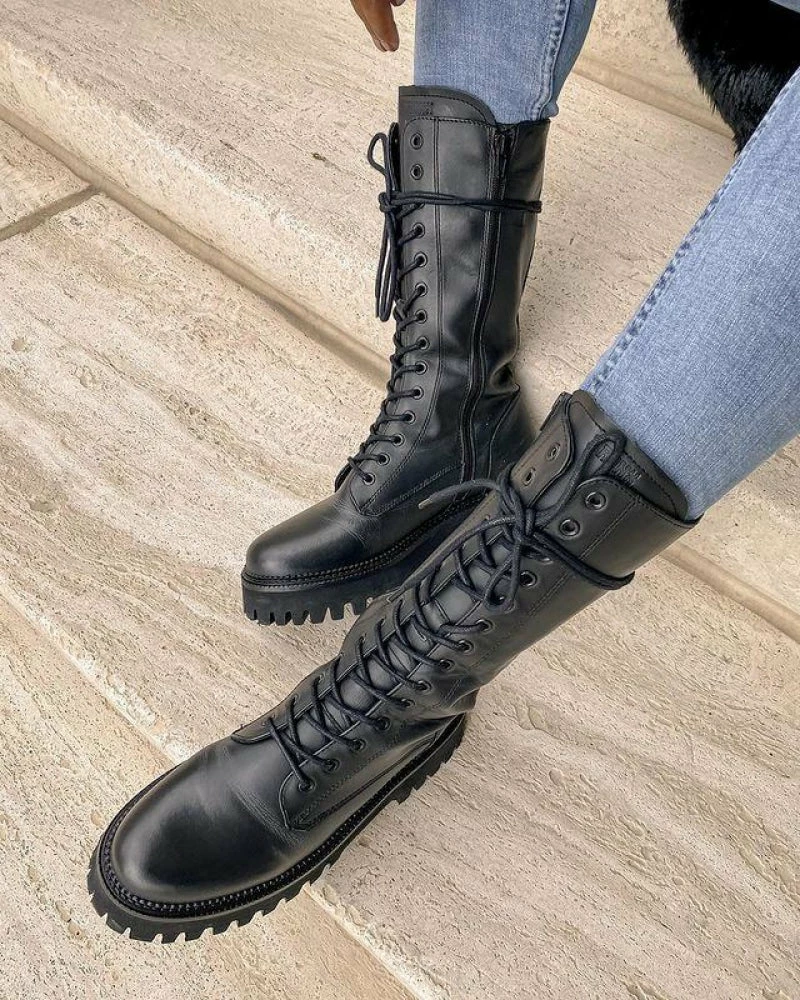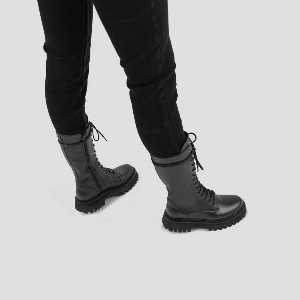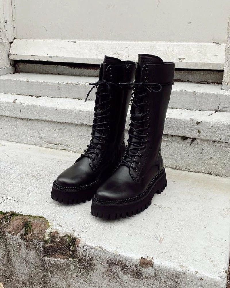 t gives you the option to either tie the lace normally or wrap them around the calves to deliver a fashion statement. The zip fastening adds a surprise element on these lace-up boots. The insoles are warm, comfy, and do not tire your feet all through the day. The rubber outsole is rugged, durable, and long-lasting. Match these chic biker boots with skinny jeans, shorts, or a short dress with an overcoat, and showcase your best looks.