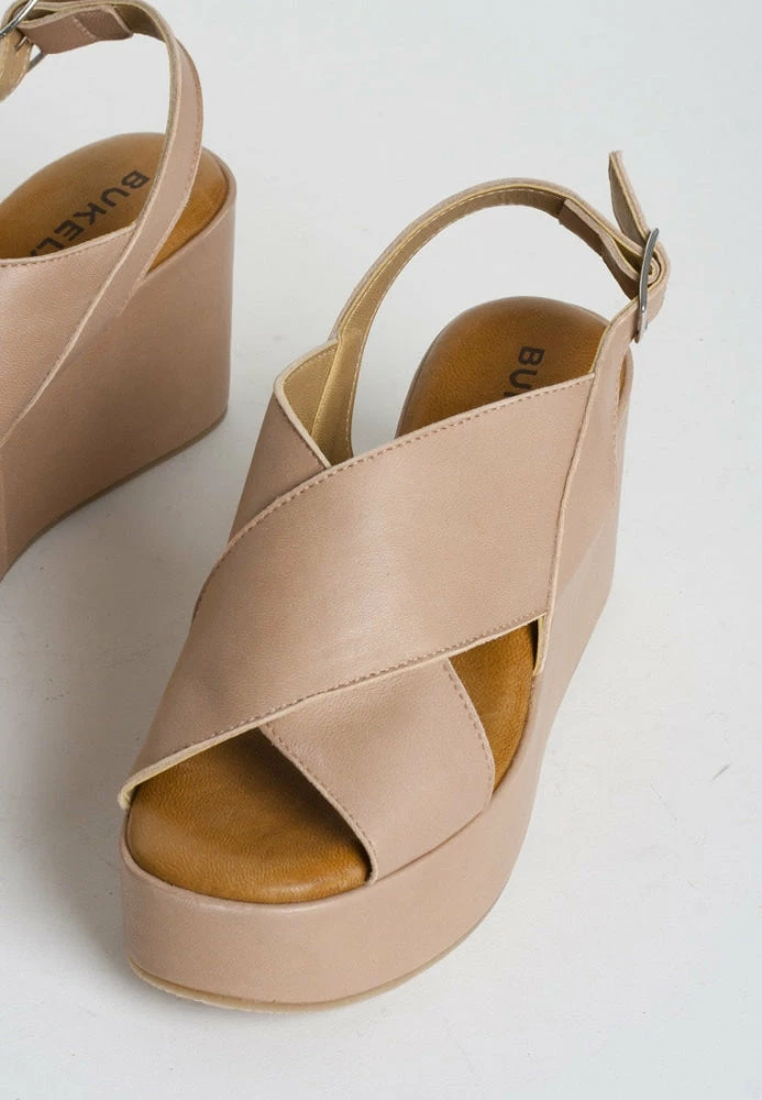 | Brand Model Product number Category Color Material Lining Closure Sole Made in | BUKELA Bianca BIANCA-NUDE Sandals Nude 100% Leather 100% Leather Adjustable Pin-buckle Light platform Italy |