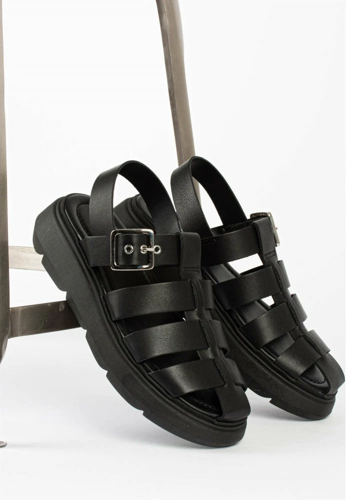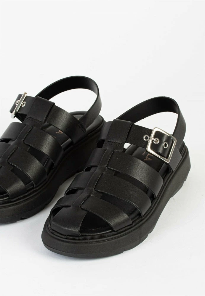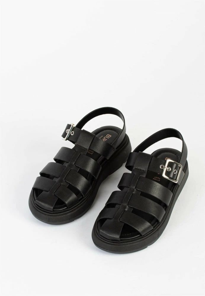 | Brand Model Product number Category Color Material Lining Closure Outsole Made in | BUKELA Elisa ELISA-BLACK Sandals Black 100% Leather Leather Adjustable Pin-buckle Rubber Italy |