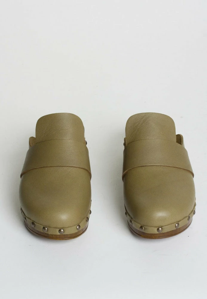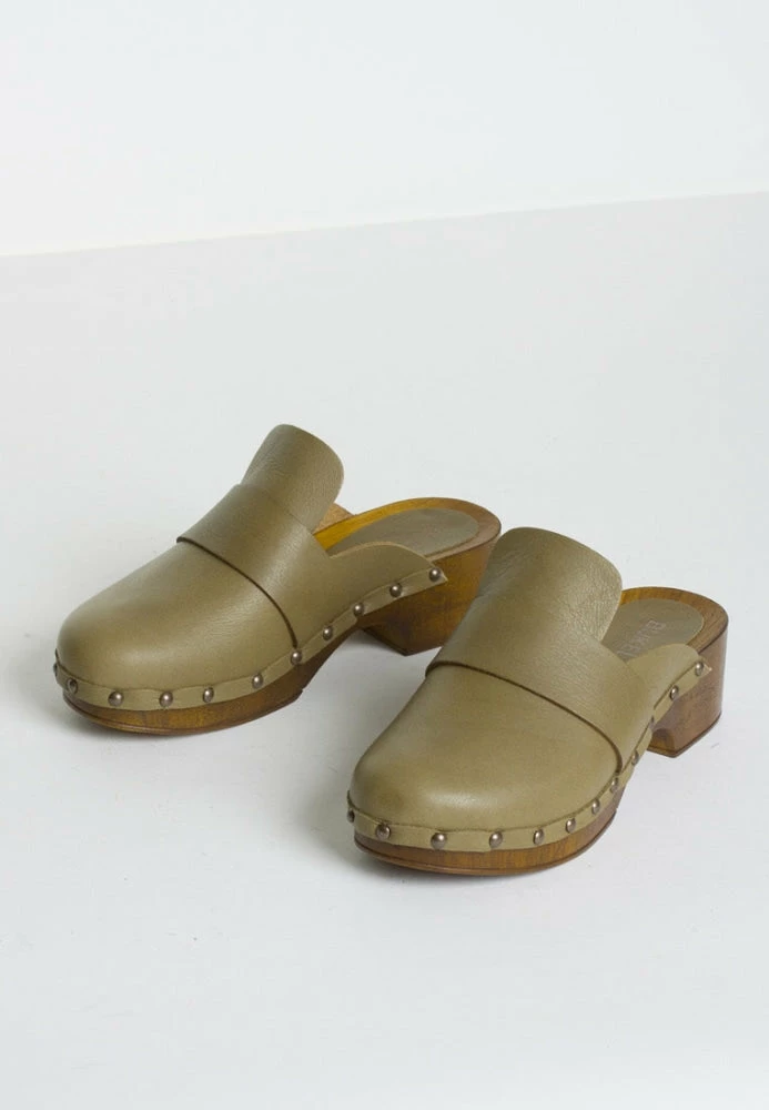 | Brand Model Product number Category Color Material Lining Closure Outsole Made in | BUKELA Ester ESTER-OLIVE Clogs Olive Leather / Wood Leather Slip-on Style Wooden Platform Sole Italy |