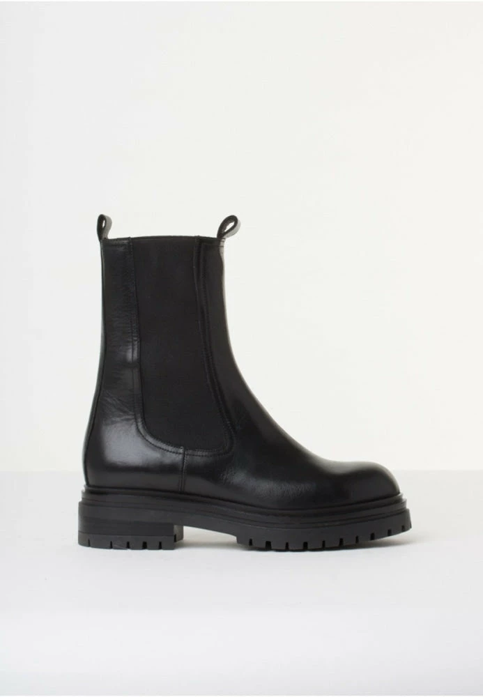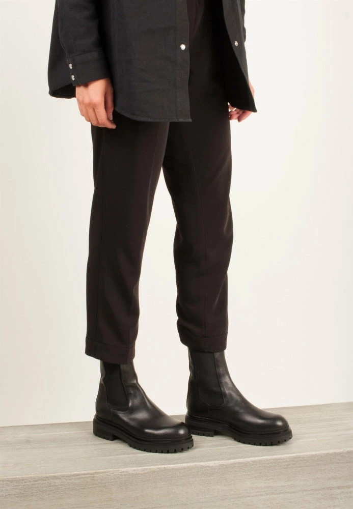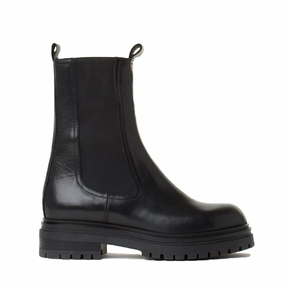 | Brand Model Product number Category Colour Material Lining Sole Details Shaft Height Platform Height Made in | BUKELA Teo Teo-Blk-21 Chelsea Boots Black 100% Leather 100% Leather 100 % Rubber Side elastic inserts 19 cm 4 cm Italy |
