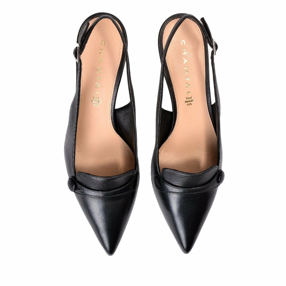 | Brand Model Product number Category Color Material Lining Heel Heigh Outsole | CHANTAL Carpetto 1002/Black Heels Black Leather Leather 6.5 cm Leather |