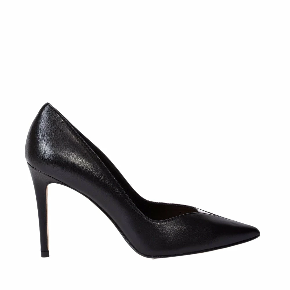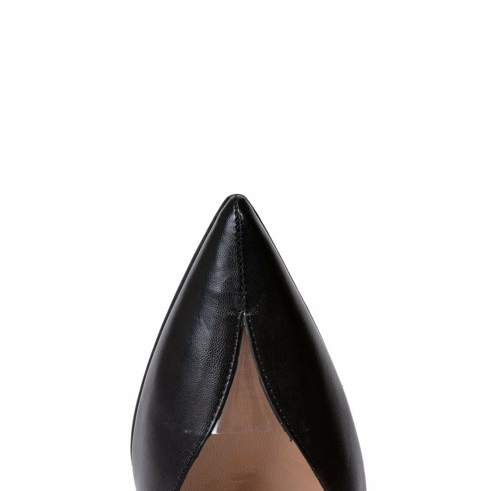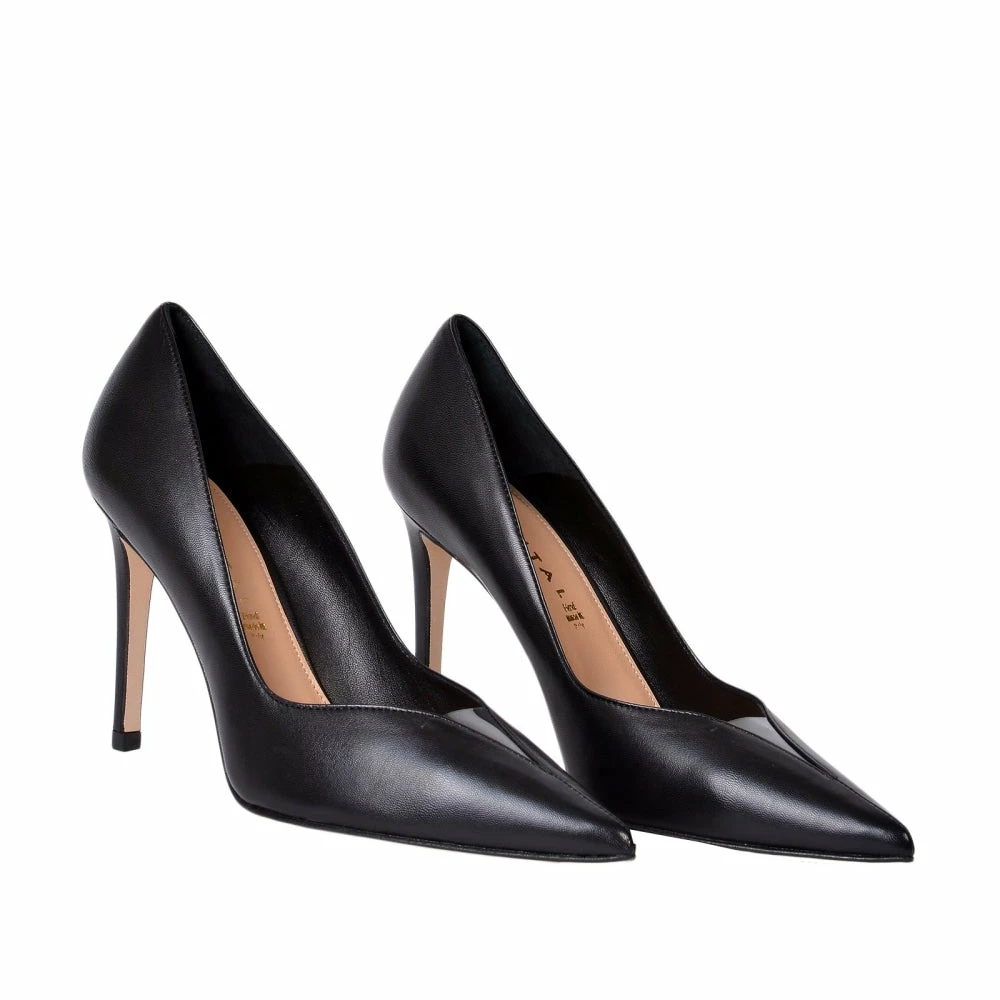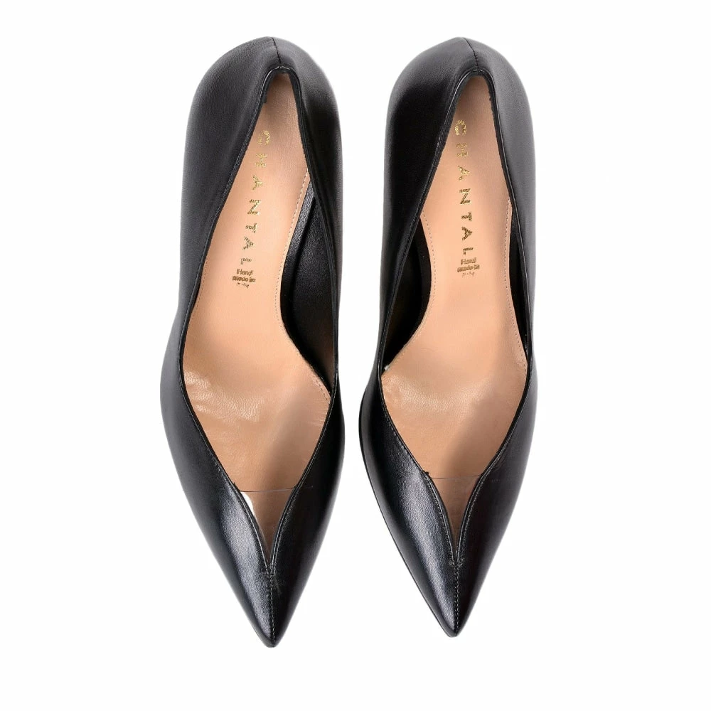 These black leather pumps are one of Chantal’s most iconic silhouettes. This Italian-crafted pair are made of soft point toe with a thin stiletto heel and with a unobtrusive transparent detail in the front of the shoe.