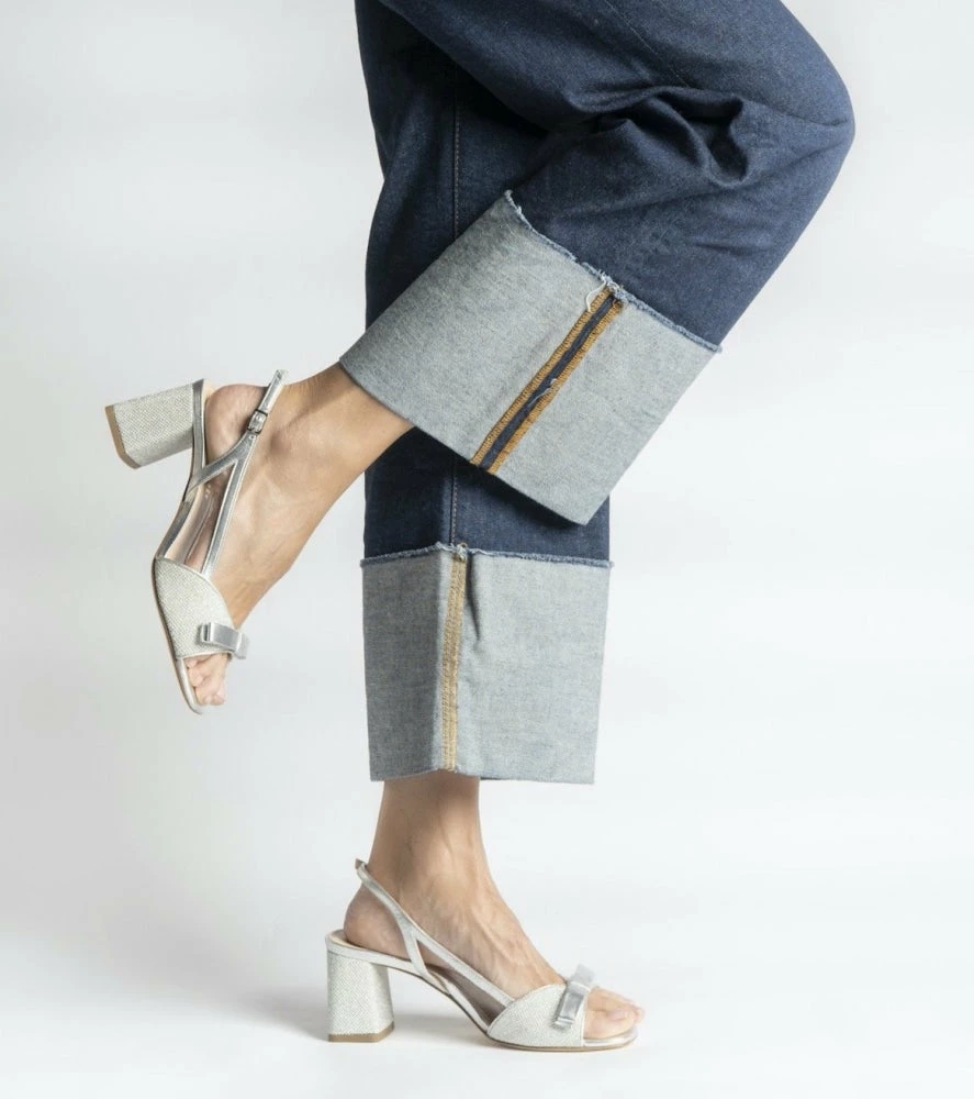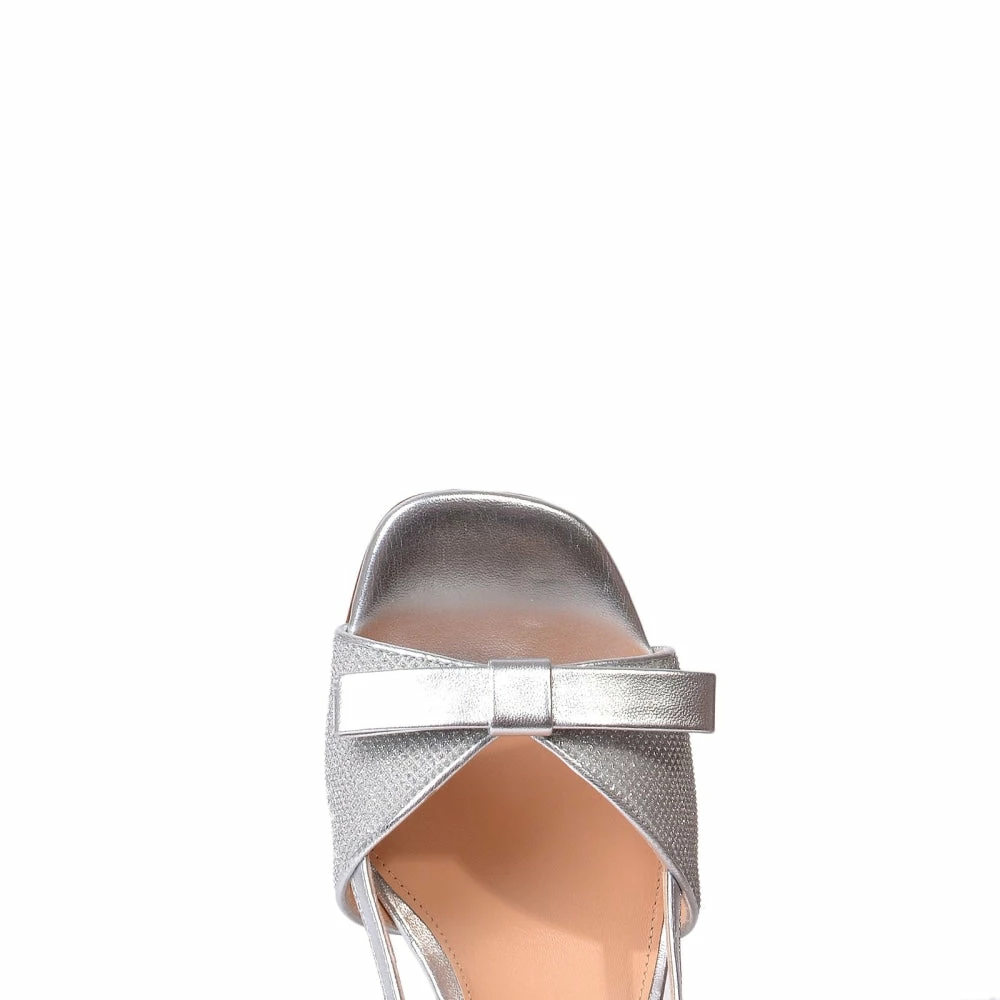 The feminine ethos is depicted by the metallic crinkled-leather construction of these silver sandals. Handmade in Italy, they are set on a chunky block heel and the ribbon is just for a luxury shade.Â