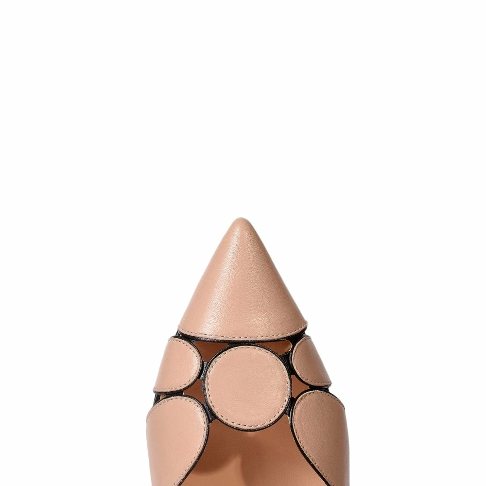 Handmade in Italy, they’re designed to a pointed profile. Opt for a timelessly elegant look with Chantal’s beige slingback pumps, leather lining and insole.