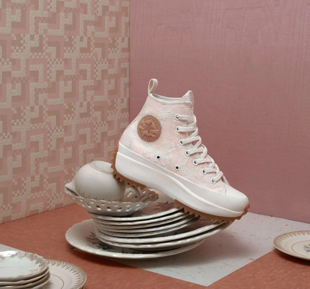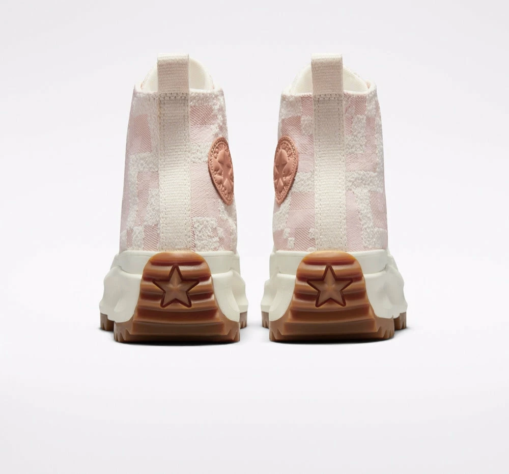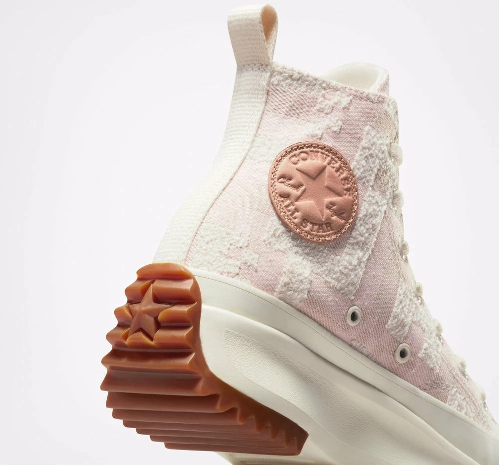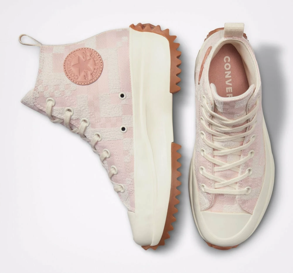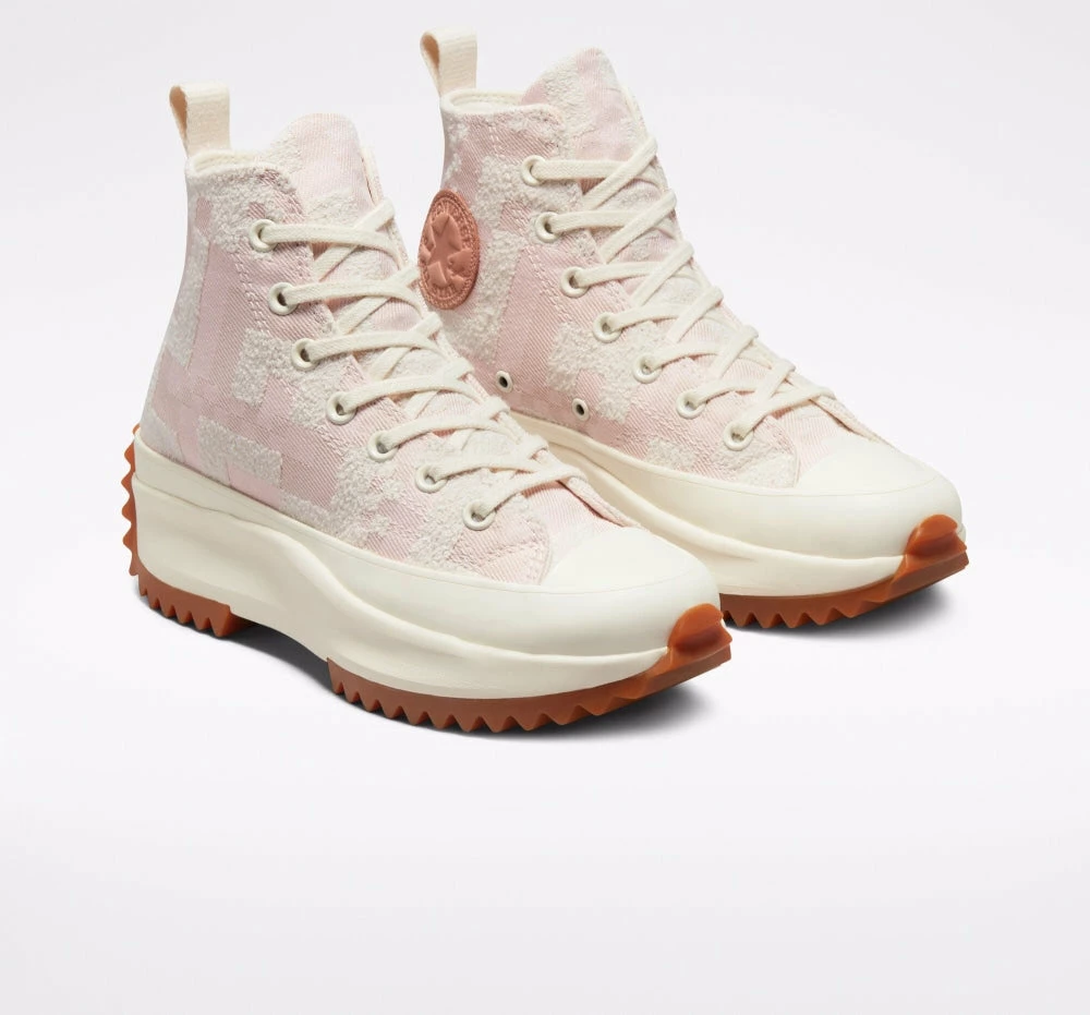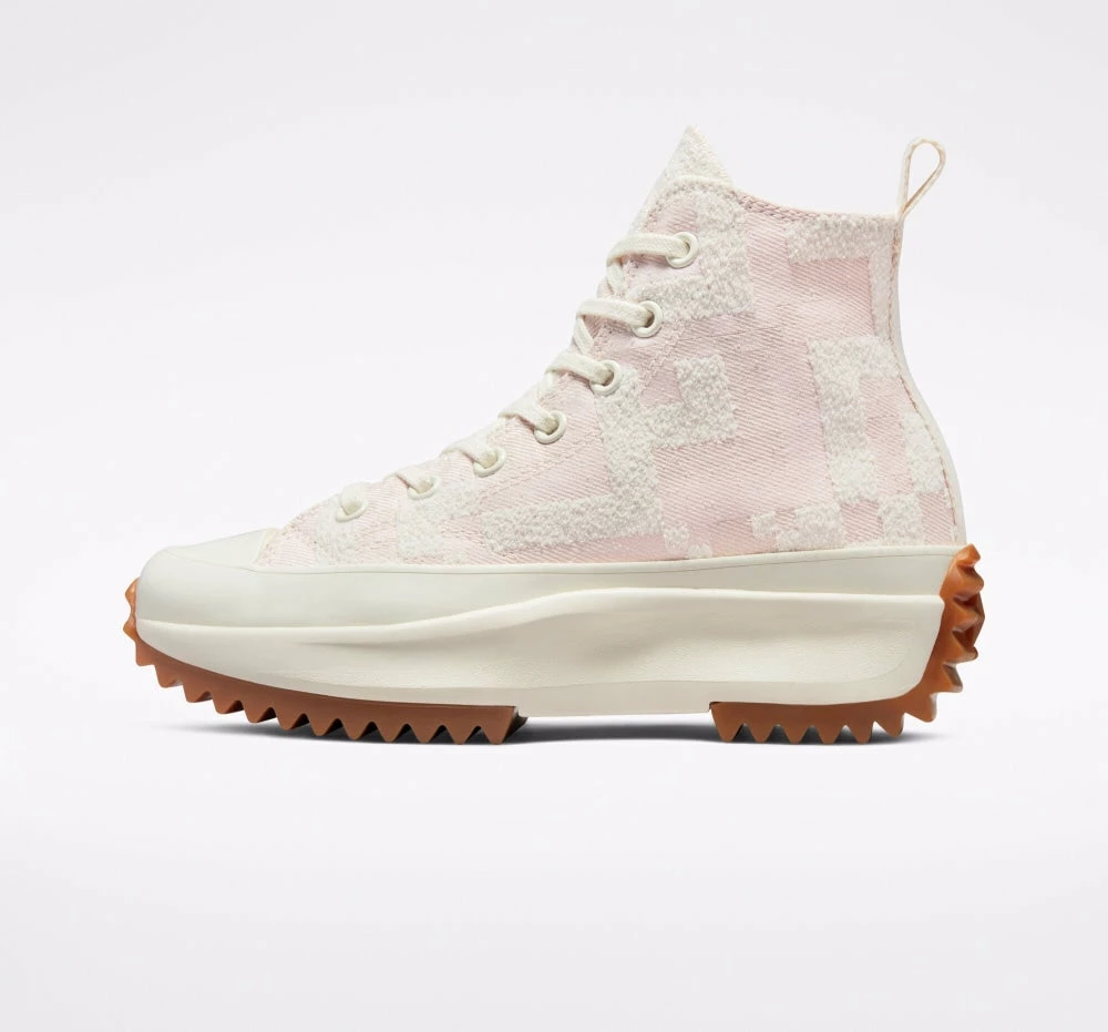 | Brand Model Product number Category Colour Material Outsole Closure | CONVERSE Run Star Hike 172714C Â Hi Sneakers Egret / Pink Clay / Storm Pink Textile Saw-Tooth Sole, Rubber Outsole. Laces |