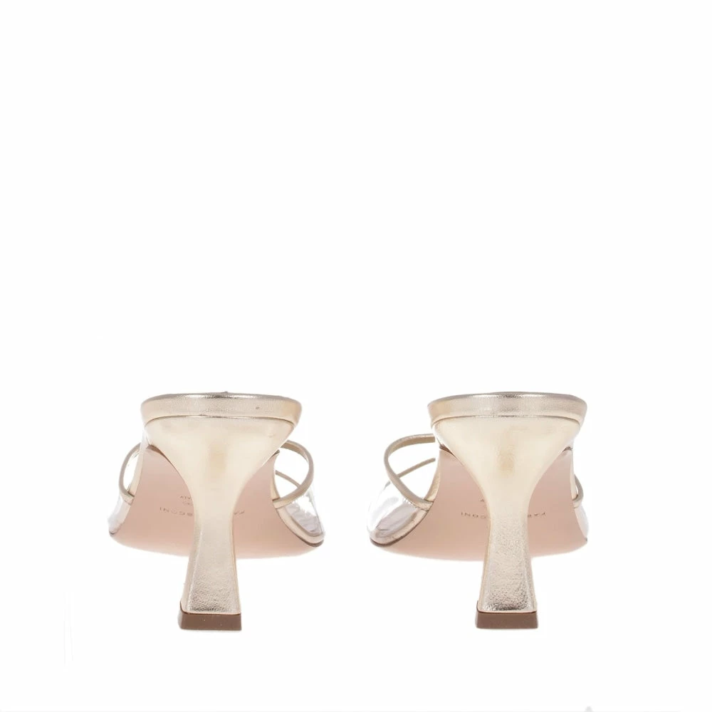 These easy-to-wear Fabio Rusconi’s Diba mules capture the label’s glamorous yet contemporary appeal. They’re crafted in Italy with a luxor platinum leather and PVC panel framed by smooth leather, then set on a square-toed sole and narrow stiletto heel.Â