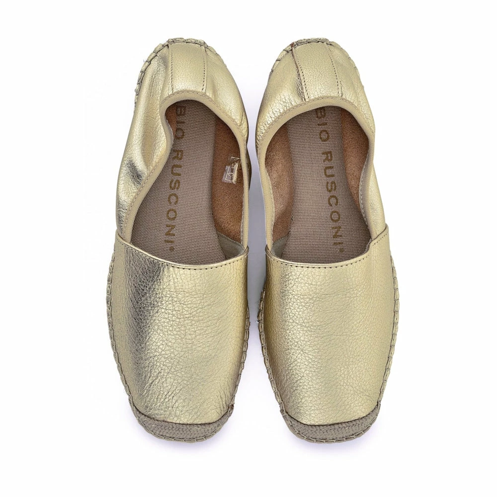 | Brand Model Product number Category Color Material Lining Outsole Heel Height | FABIO RUSCONI Dolores ALICIA-NAPPA-METAL-ORO Flats Gold 100% lamb Leather 100% Leather 100% rubber 20 mm |