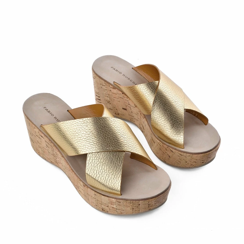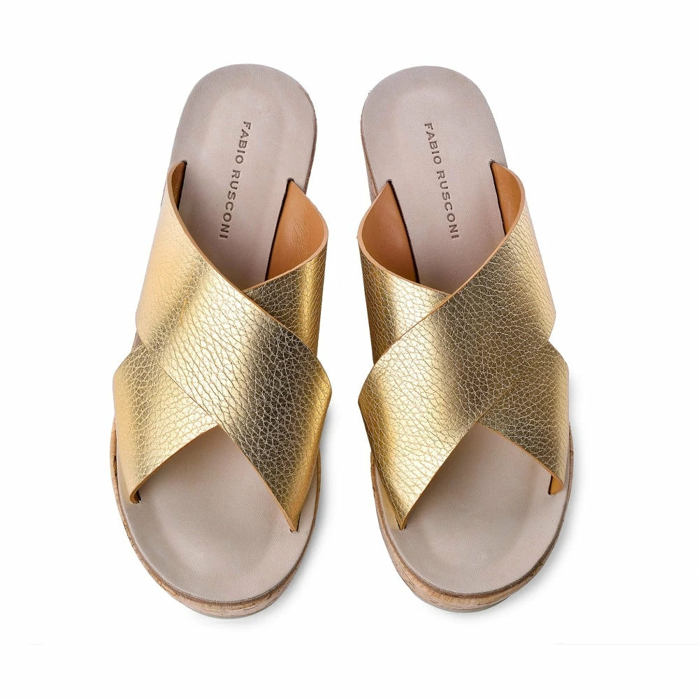 | Brand Model Product number Category Color Material Lining Outsole Heel Height | FABIO RUSCONI Dora DORA318F Sandals Gold Metallic Leather 100% Leather 100% rubber 8 cm |