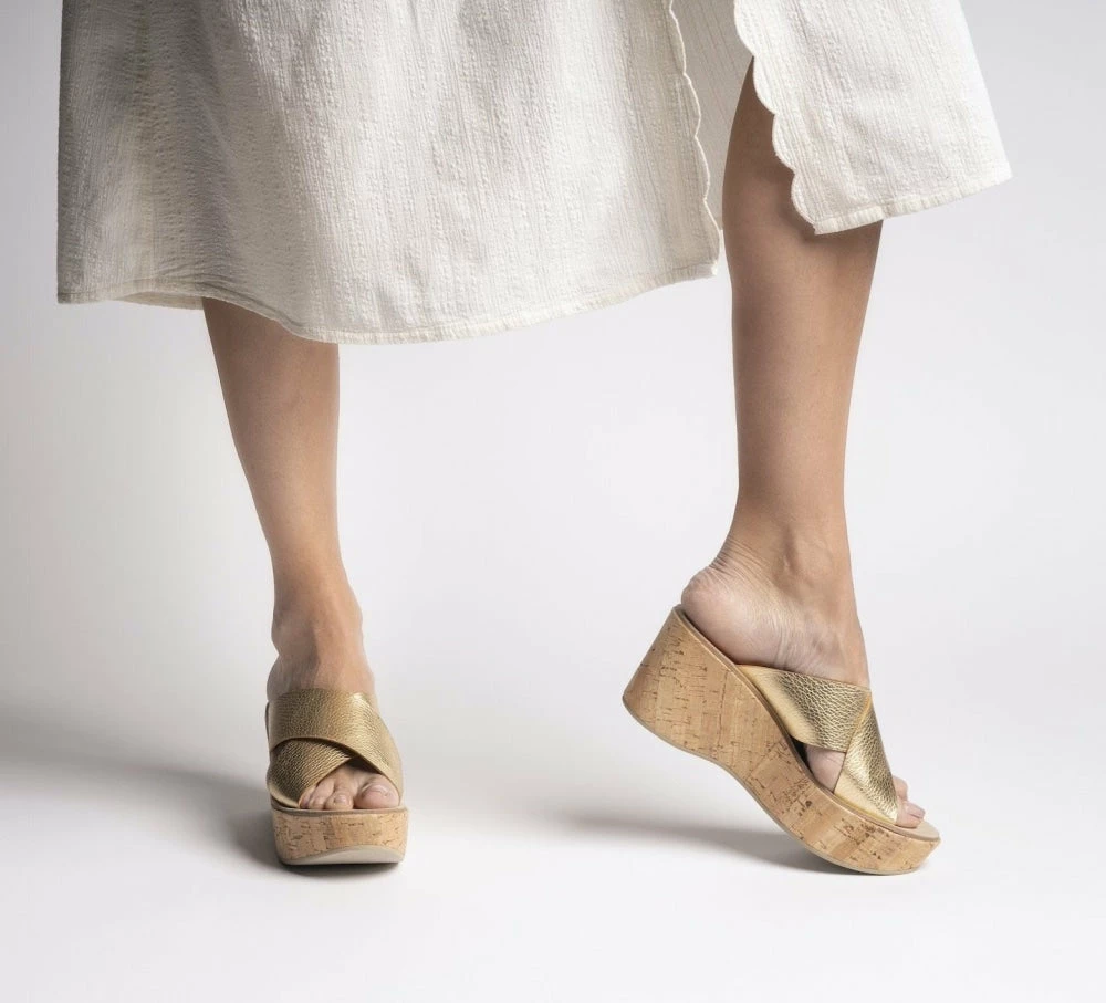 These slip-on ‘DORA’ platform wedges from FABIO RUSCONI feature crossover straps on the front, and a cork platform heel. The top straps are made with genuine leather and given a metallic finishing. The wedge heel of 8 cm and comfortable insole makes sure you wear these 70s platform shoes with ease.