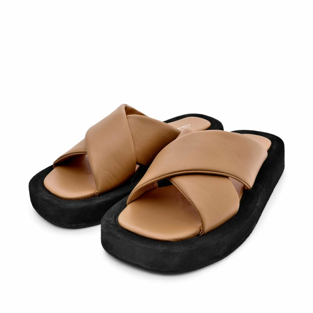 These ‘Beige’ sandals are made with smooth and silky 100% lamb leather with 100% lamb leather lining. They feature criss-cross padded leather straps, a cushioned and padded footbed with a 3 cm platform in black shade.