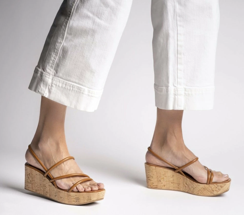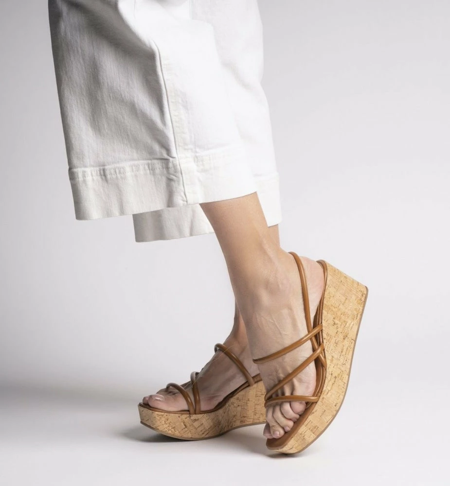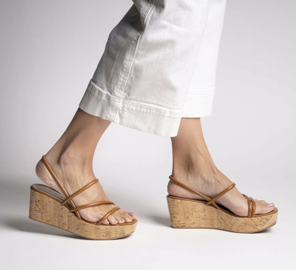 The contemporary and edgy wedges are made with high-grade and soft cow leather and a sturdy cork platform. The elastic slingback fastening makes sure they stay true to the size and give a sexy appeal to your legs. The stylish yet comfortable and lightweight cognac wedges are great to be worn all day long without any discomfort.