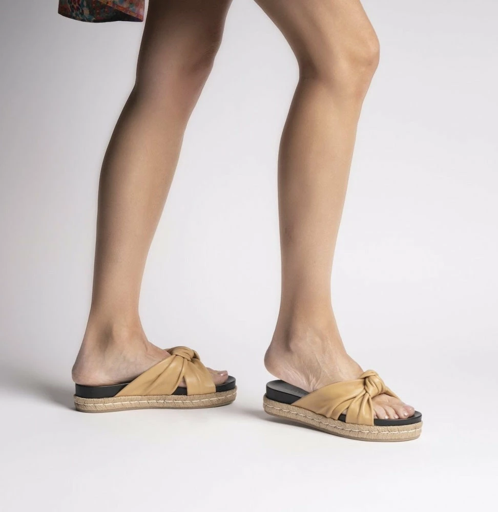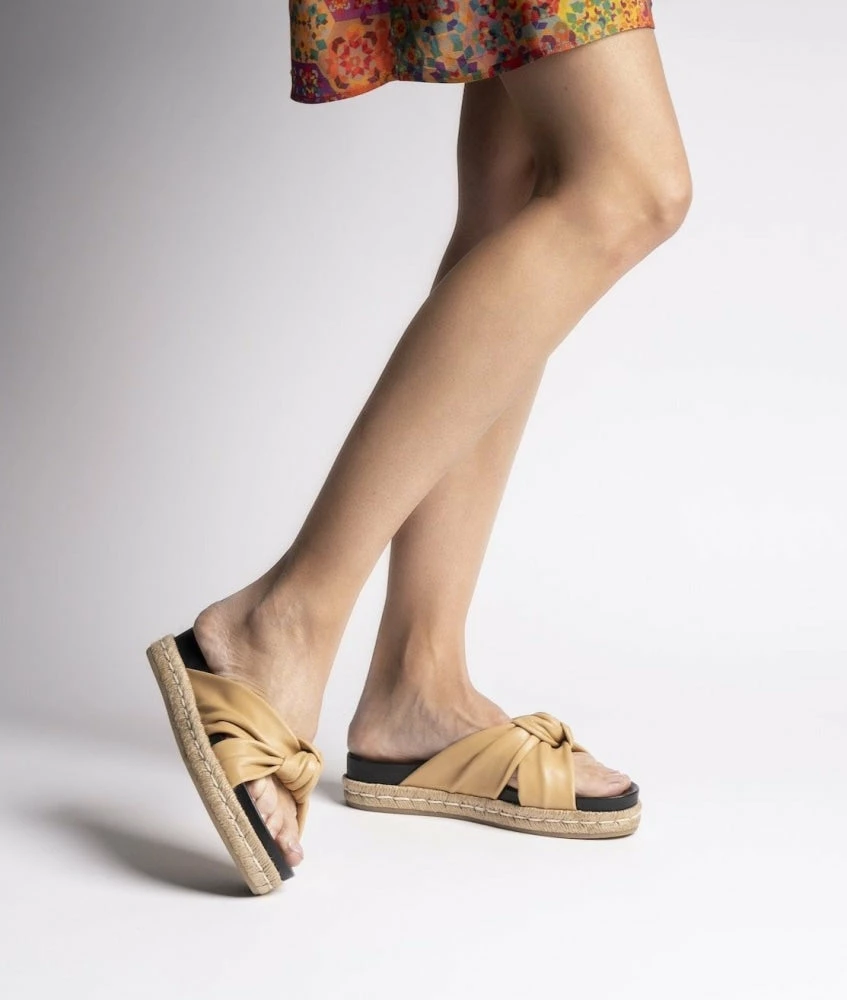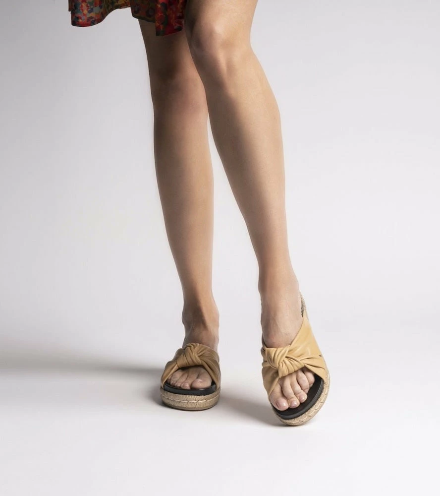 With 4 cm platform height and comfortable insoles, wearing these shoes is a pleasurable experience. The criss-cross ribbon design in cow leather on the top makes these slip-on sandals a perfect choice of a modern woman.