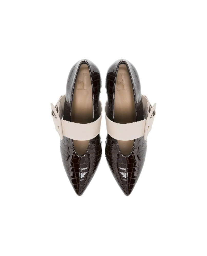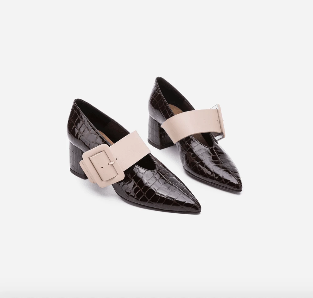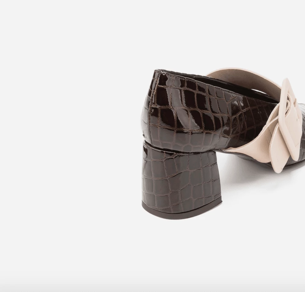 Heeled shoes, adorned with an oversized wrapped leather buckle and a squared off toe, these are the epitome of Gran Glam.