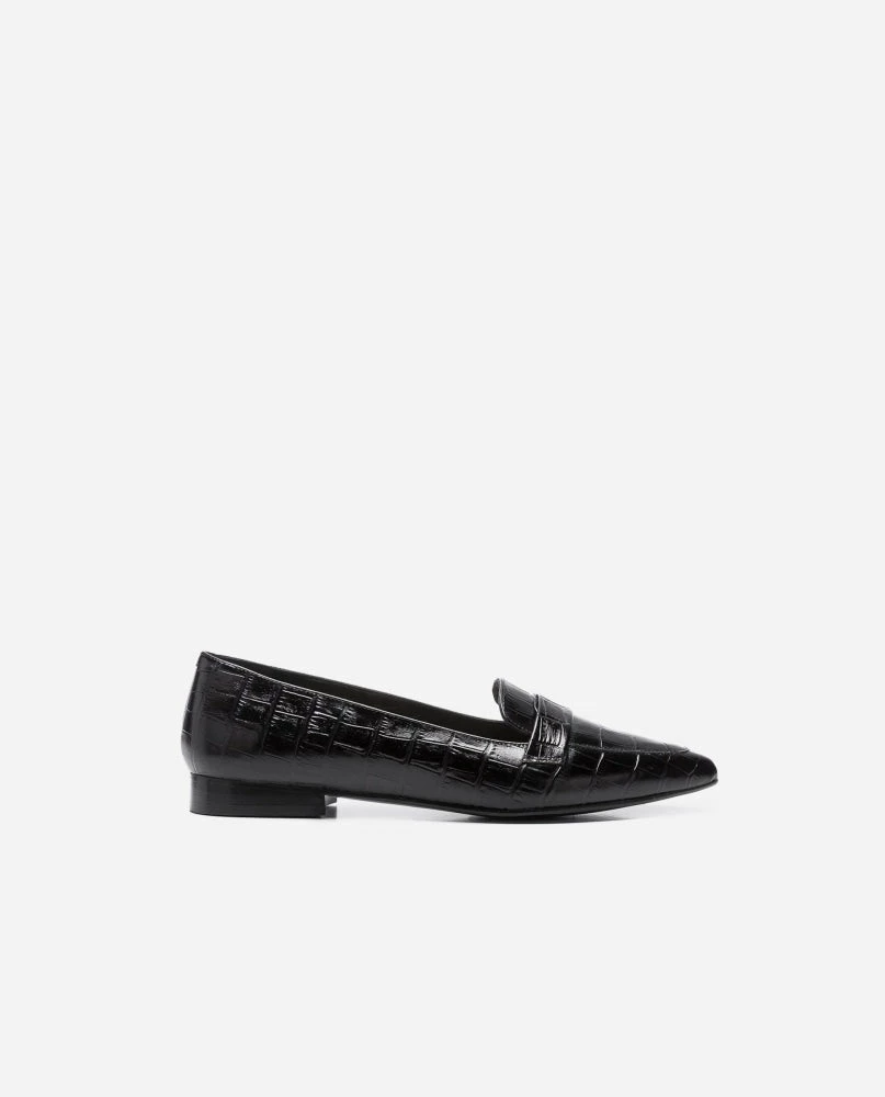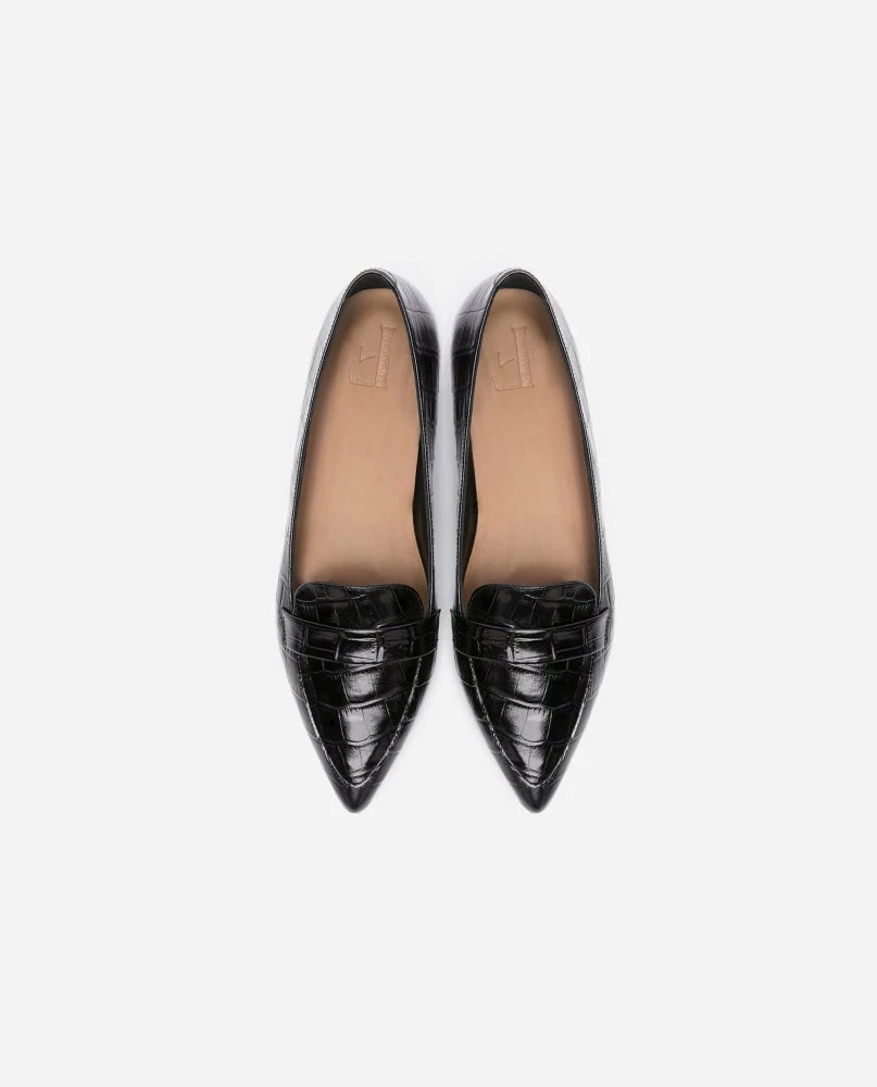 | Brand Model Product number Category Colour Handmade in Outer Material Lining Outsole Heel Height Shoebox Dustbag | Flattered Alexandra 20010100317-001 Flats Croco Black Elche, Spain Cow Leather (Bos Taurus) Chrome-free Goat leather (Capra Hircus) Thunit (rubber) 15 mm. Pointed toe Recycled paper, no glue and colorants Certified organic cotton, fair trade wood |