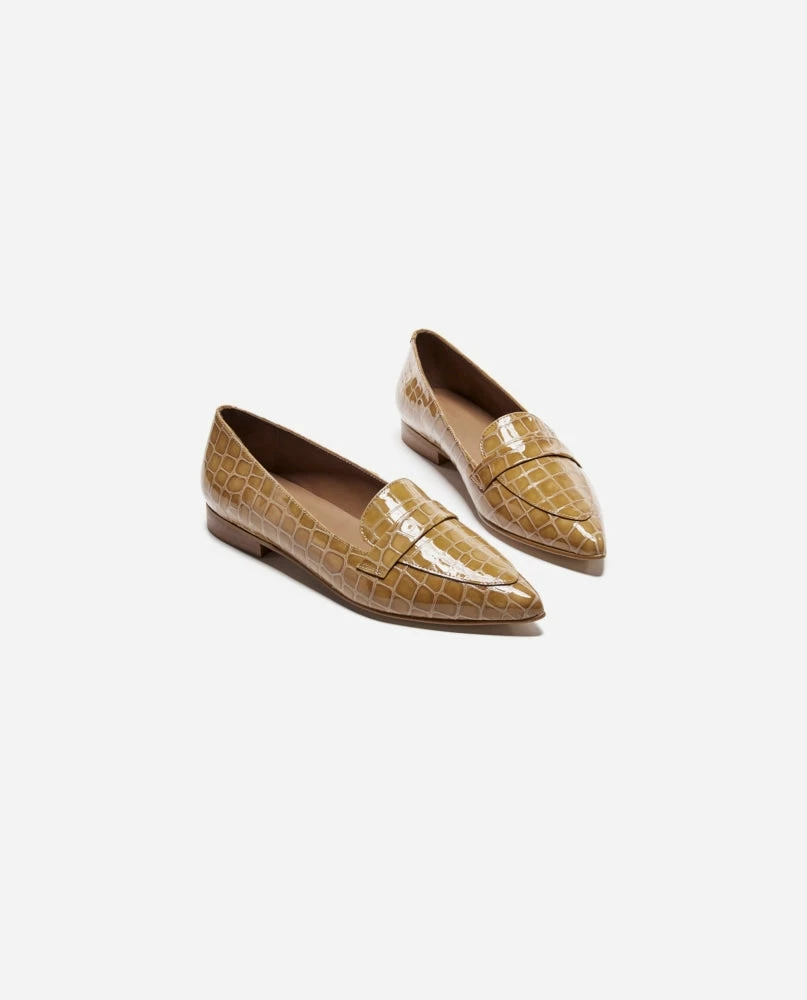 | Brand Model Product number Category Colour Handmade in Outer Material Lining Outsole Heel Height Shoebox Dustbag | Flattered Alexandra 21010100317-038 Flats Croco Shiny Beige Elda, Spain Goat (Capra Hircus) Goat leather Chrome-free (Capra Hircus) Thunit (rubber) 10 mm. Pointed toe Recycled paper, no glue and colorants Certified organic cotton, fair trade wood |
