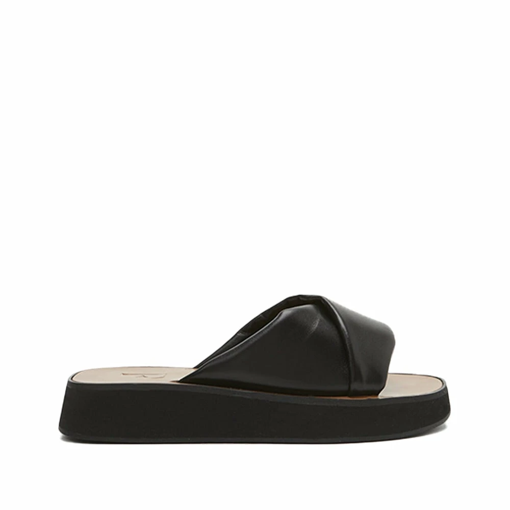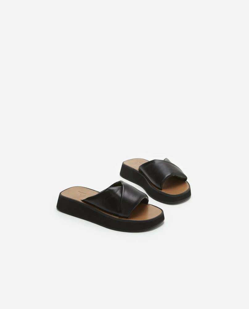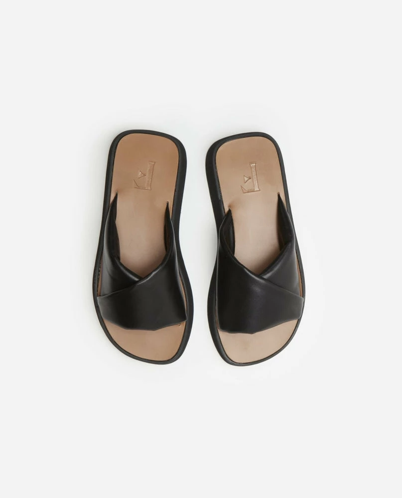 | Brand Model Product number Category Colour Heel Height Handmade in Outer Material Lining Outsole Shoebox Dustbag | Flattered Bea 22010721101-001 Sandals Black 3.5 cm Elda, Spain Goat Leather (Capra Hircus) Goat Leather (Capra Hircus) EVA Recycled paper, no glue and colorants Certified organic cotton, fair trade wood |