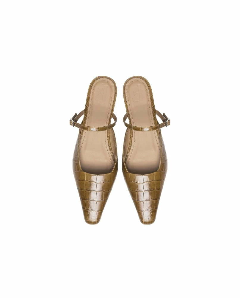 | Brand Model Product number Category Colour Handmade in Outer Material 1 Outer Material 2 Lining Outsole Heel Height Shoebox Dustbag | Flattered Dolores 2010612117-024 Flats Cognac Croco Elche, Spain Cow Leather (Bos Taurus) Lamb (Ovis Orientalis Aries) Goat Leather – Chrome-free (Capra Hircus) Thunit (rubber) 12 mm. Long squared toe Recycled paper, no glue and colorants Certified organic cotton, fair trade wood |
