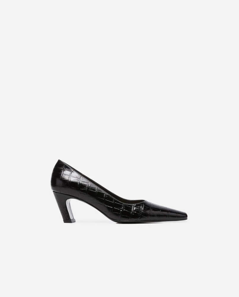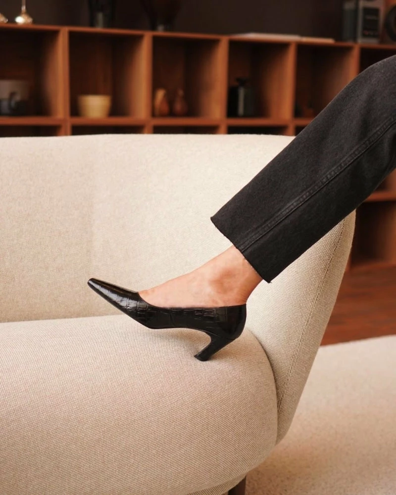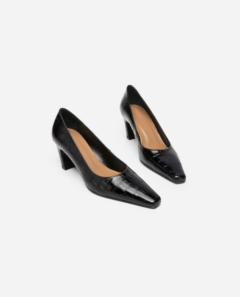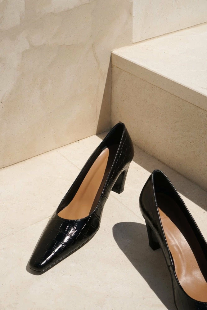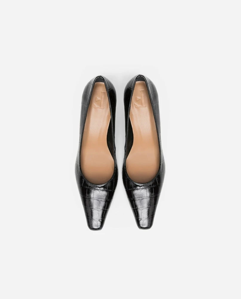 | Brand Model Product number Category Color Handmade in Outer Material Lining Outsole Heel Height Shoebox Dustbag | Flattered Iggy 20010411217-001 Heels Black Croco Elda, Spain Goat Leather (Capra Hircus) Goat Leather – Chrome-free (Capra Hircus) Thunit (rubber) 50 mm. Long squared toe Recycled paper, no glue and colorants Certified organic cotton, fair trade wood |