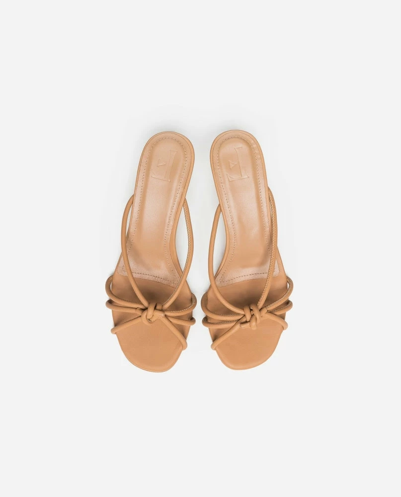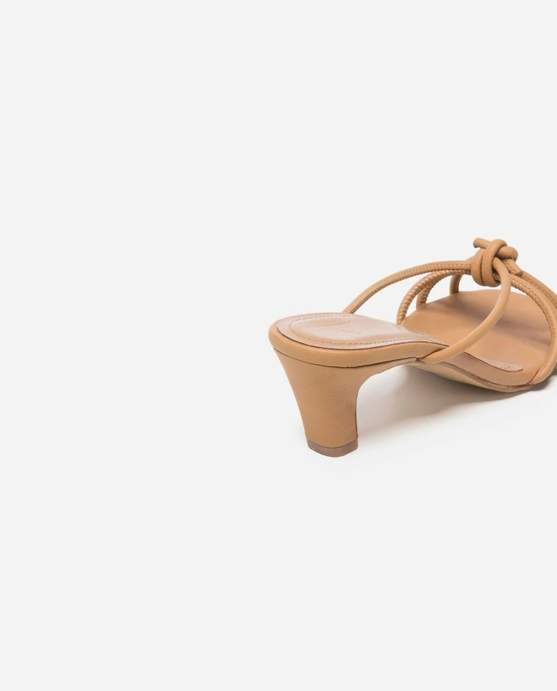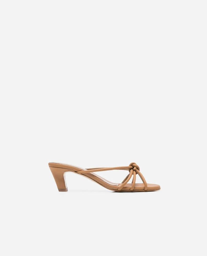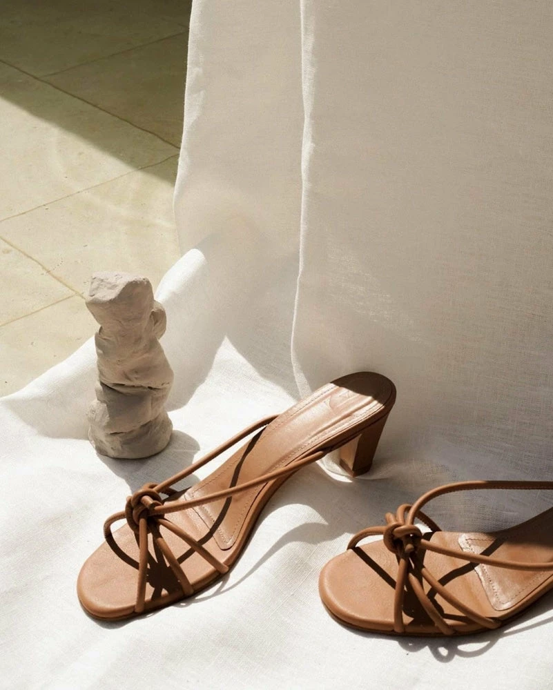 Handmade in soft leather, with a 50mm heel and straps that tie up into a breezy knot over the foot. Available in brown and black.Â