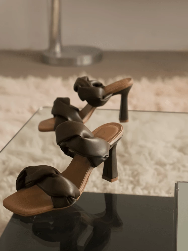 Handmade in soft vegan leather, with a 85mm heel and soft straps that tie up into a breezy knot over the foot. Available in black leather. A pump with a high 85 mm heel and padded twisted straps.