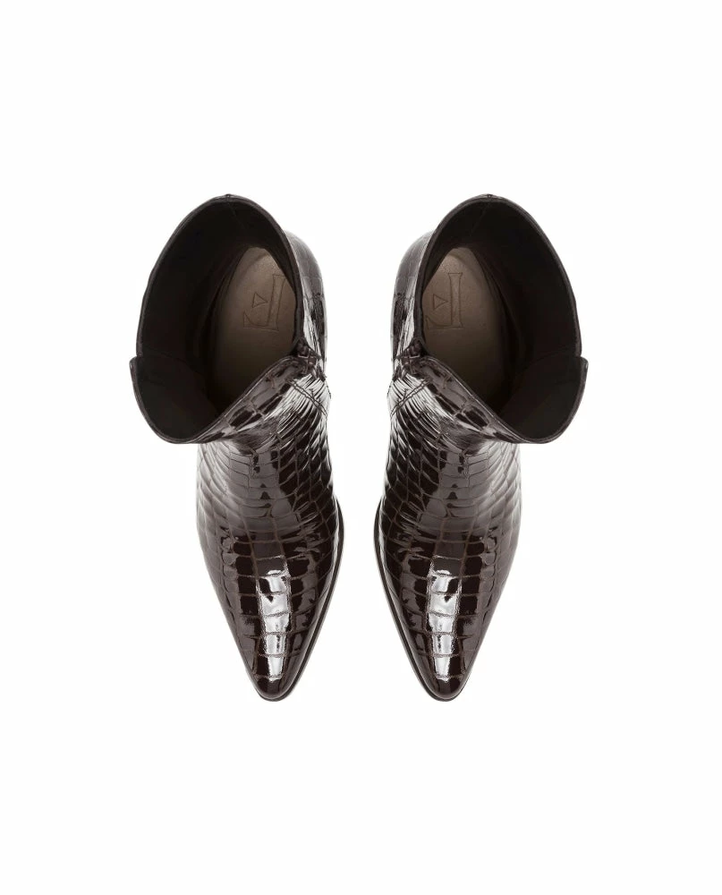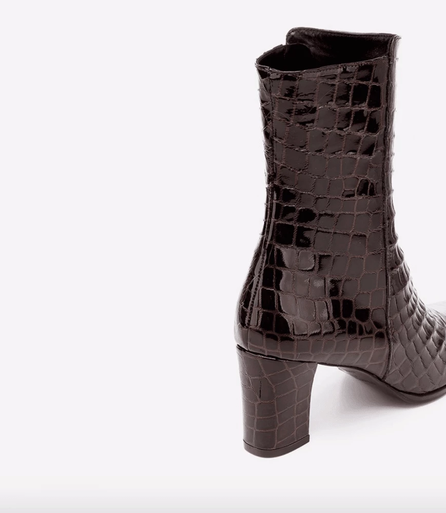 | Brand Model Product number Category Colour Handmade in Outer Material Lining Outsole Heel Height Shoebox Dustbag | Flattered Teddy 19020805801-006 Boots Pecan Reptile Elche, Spain Cow Leather (Bos Taurus) Chrome-free Goat leather (Capra Hircus) Thunit (rubber) 65 mm. Recycled paper, no glue and colorants Certified organic cotton, fair trade wood |