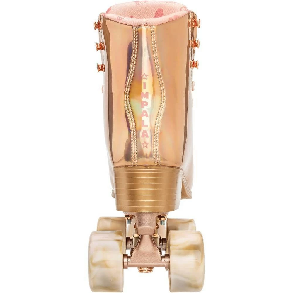 | IMPALA Marawa Rose Gold IMPROLLER1-MARAWARG Rollerskates Rose Gold * Rose gold truck, baseplate & hardware * Custom swirl marble wheels * PVC upper and heel/sole * Aluminium alloy truck and baseplate 58mm tall x 32mm wide highly * P.V. material brake stopper * ABEC 7 precision bearings * Nylon composite core for true bearing alignment * Metal speed lacing eyelets * PETA-approved vegan product |