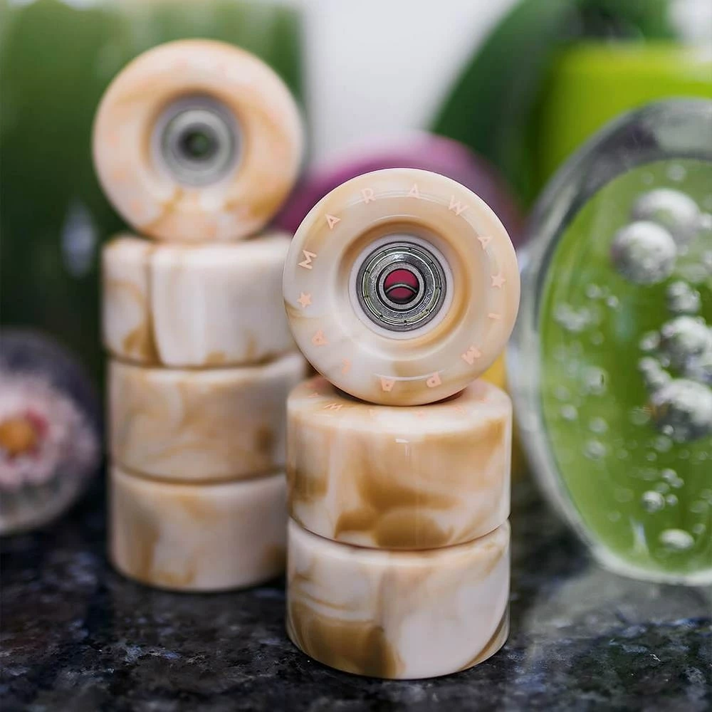 Rollerskater, hula hooper, designer, writer, artist, world record holder. We are excited to release this signature rose gold colorway with L.A. based Marawa Wamp, featuring fully customized lining artwork, marble swirl wheels and rose gold trucks, base plate and hardware.